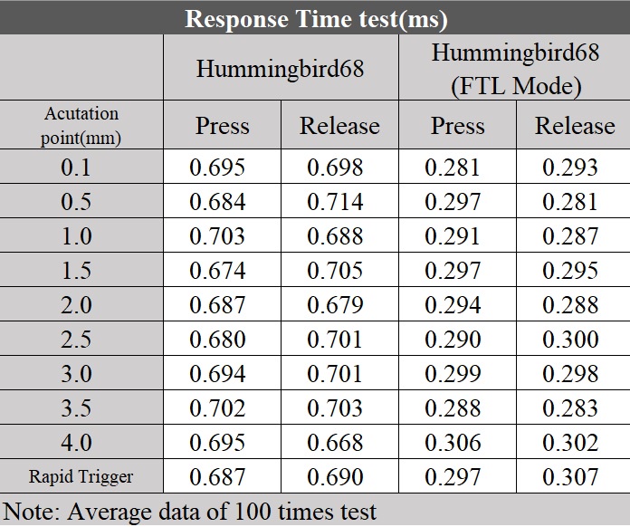 - Typing Style: Linear - Initial Force: 37±5gf - Bottom-out force: 50gf - Total Travel: 3.85±0.2mm - Pre Travel: Freely setting - Pre-Lubed: Yes - Spring: 18mm customized spring - Lifetime: 100 million times keystrokes