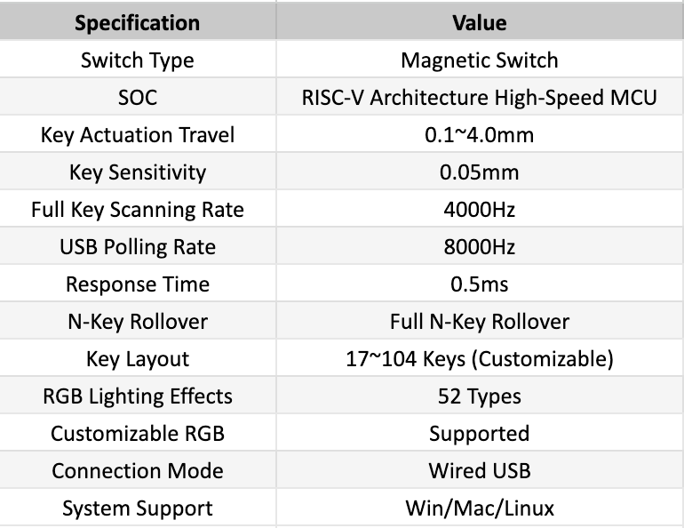 The PCB adopts a high-performance RISC-V MCU with a clock frequency of up to 144MHz, enabling rapid key scanning and algorithm processing. The chip comes with a 480MHz high-speed USB PHY, capable of achieving up to an 8000Hz polling rate. This solution achieves a full key scan time as low as 250us. It offers 50+ RGB lighting effects, allowing customizable gaming lighting. It supports custom key mapping, advanced macro commands, and other functions. With an average accuracy of <0.05mm, the entire key travel can be adjusted from 0.1mm to 4.0mm. The PCB Management software provides comprehensive keyboard management, allowing users to configure key travel, lighting mode effects/brightness/speed, advanced functions with online firmware upgrades.