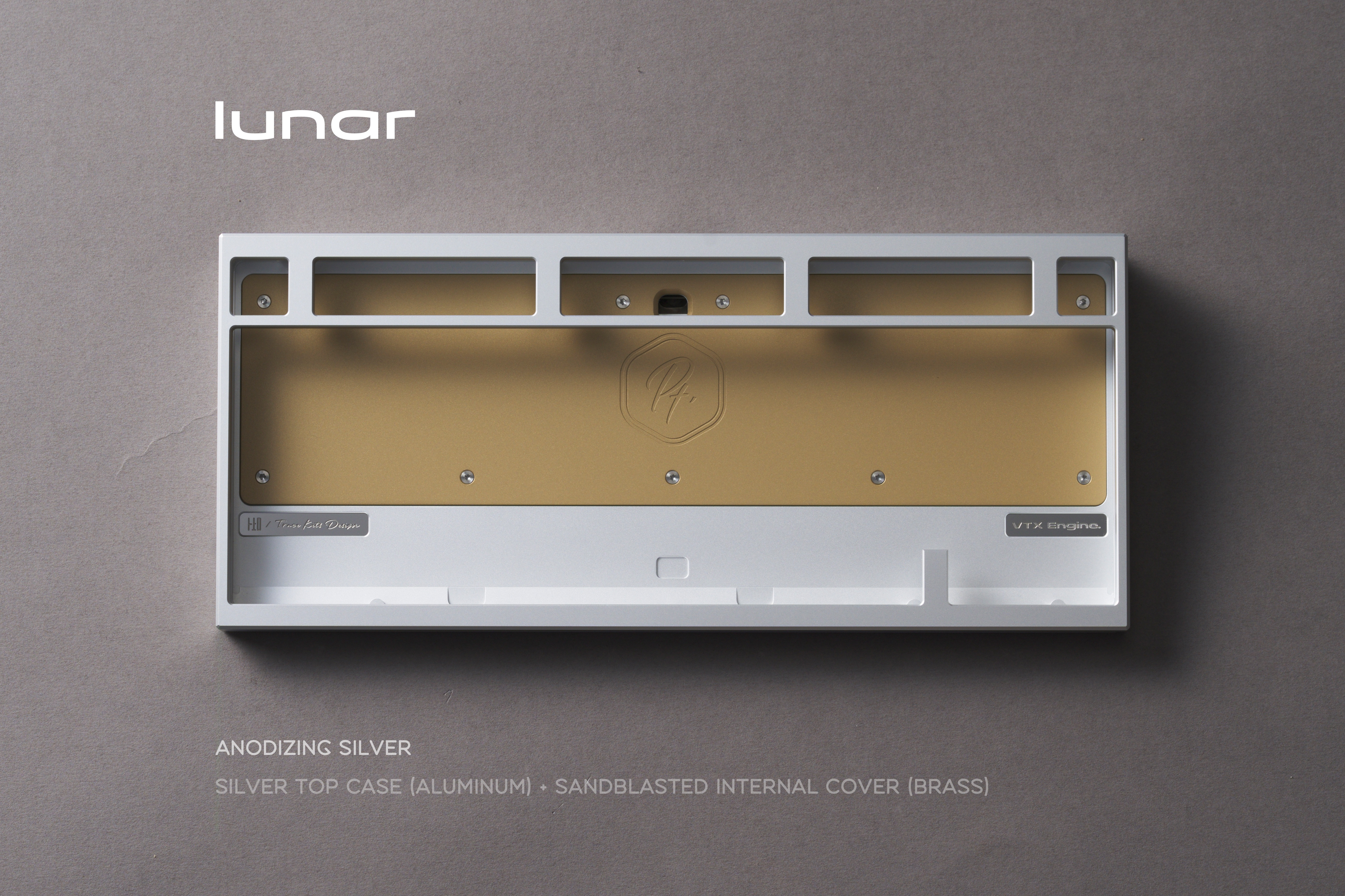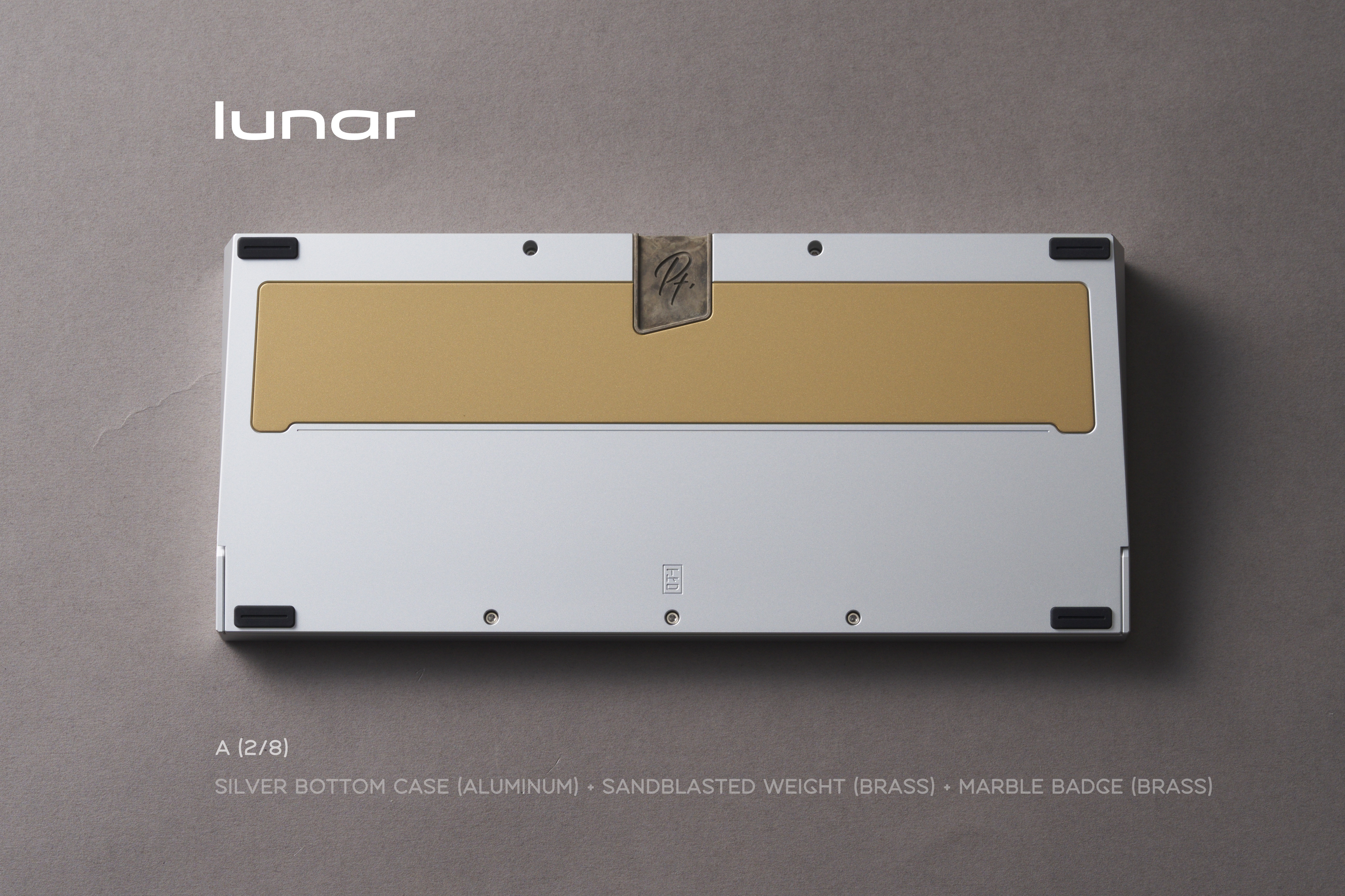 * Lunar Internal Weight: Sandblasted brass Bottom Weight: Sandblasted brass USB Port Badge: Marble-colored Copper Patina