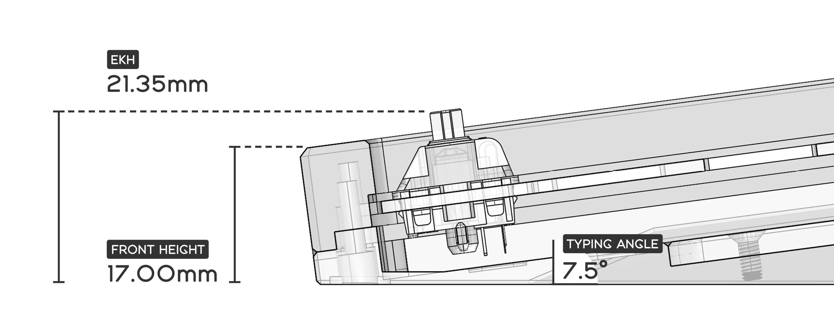Angle and Front Height: 7.5° FH = 17.00mm / EKH = 21.35mm (excluding exposed foot pads)