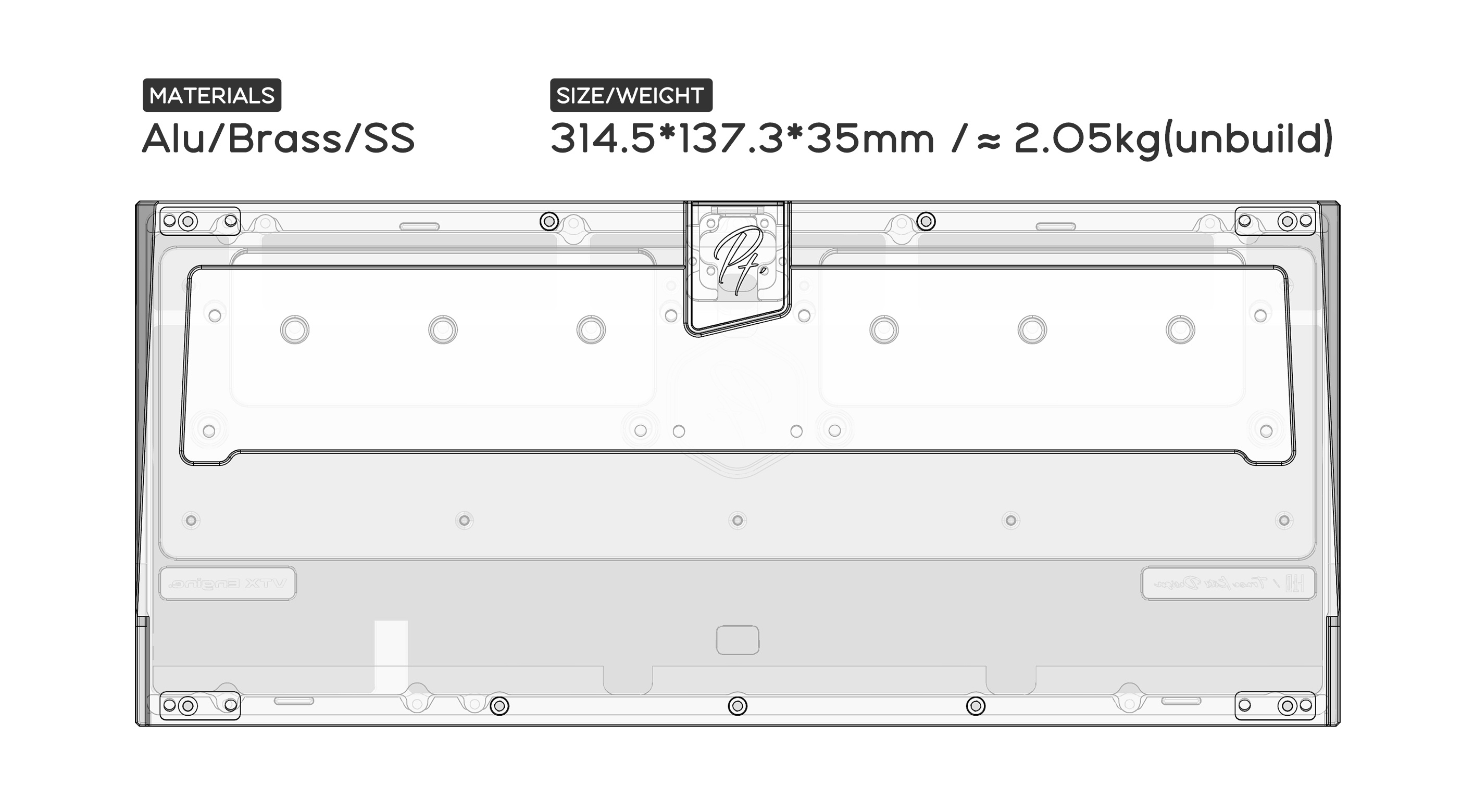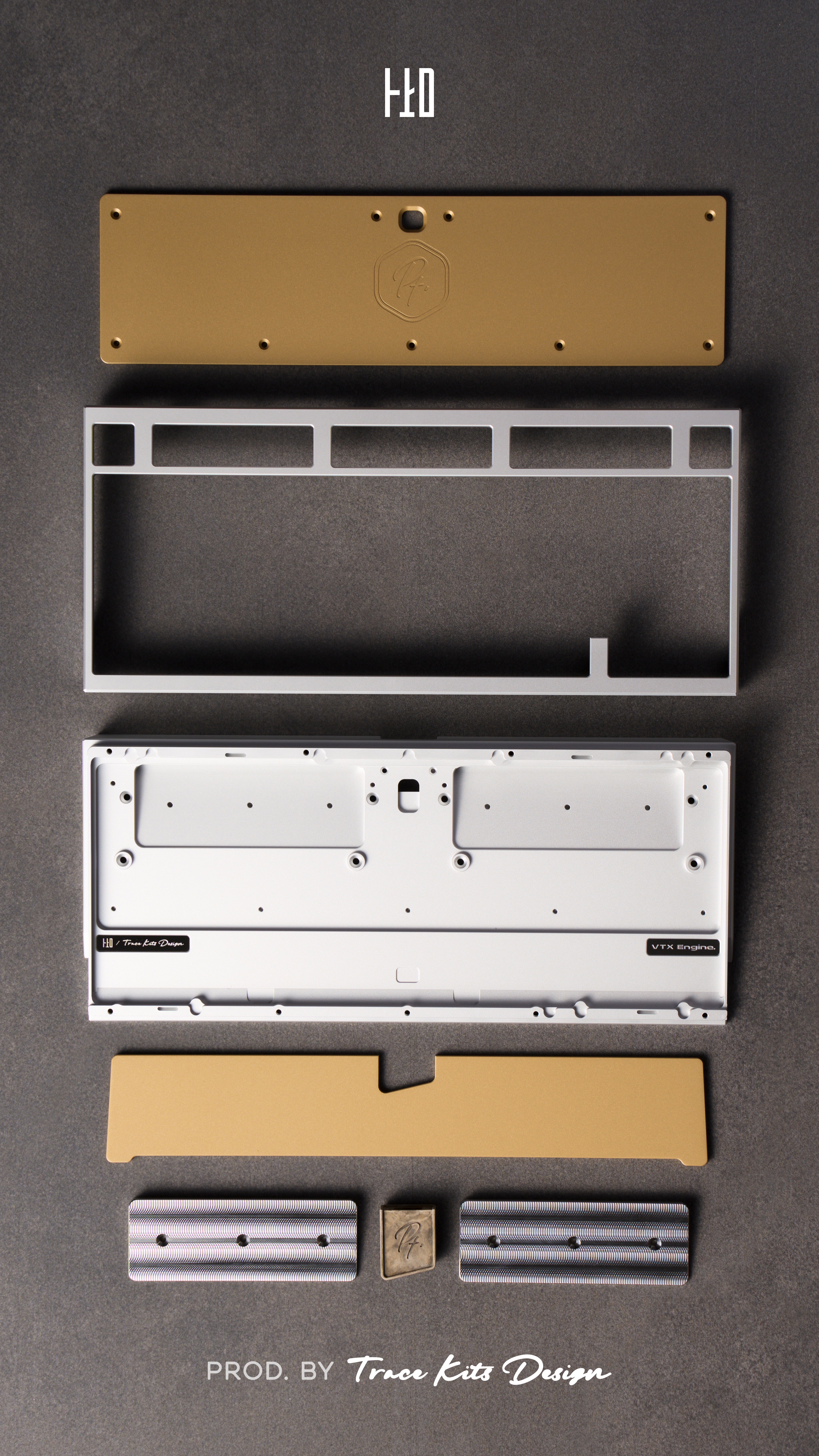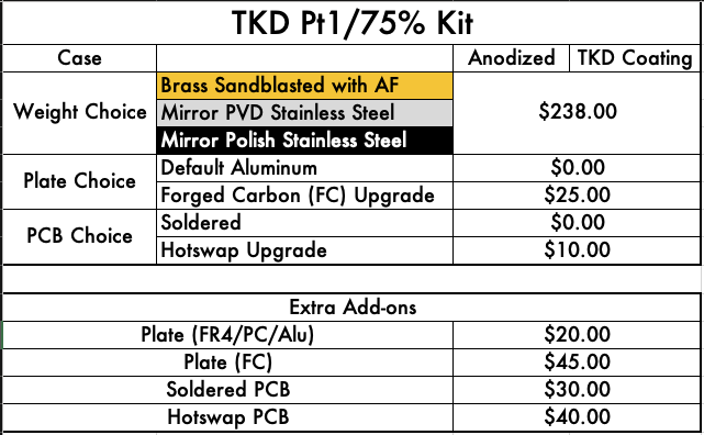 - Case (top and bottom) x1 set - Bottom weight (brass or stainless steel) x1 piece - Brass internal cover x1 piece - Brass USB port badge x1 piece - Stainless steel internal weight block x2 pieces - PCB (including ribbon cable and daughterboard) x1 set - Plate x1 piece - Foot pads x1 set - PCB stabilizers x1 set - Keyboard bag x1 piece