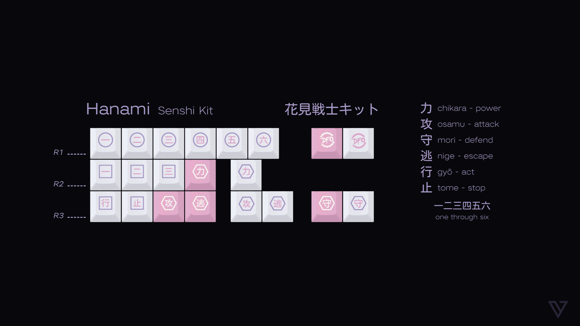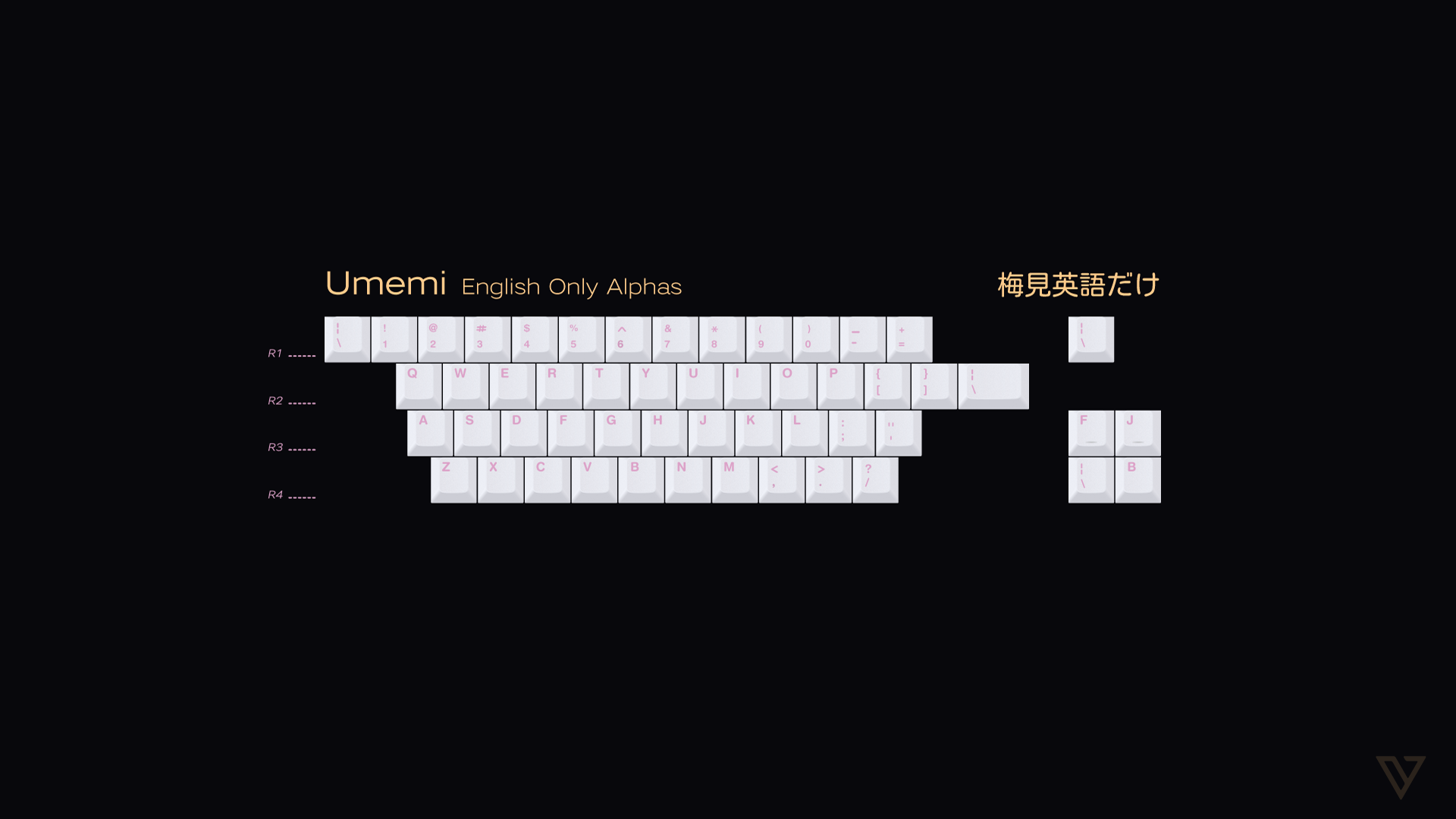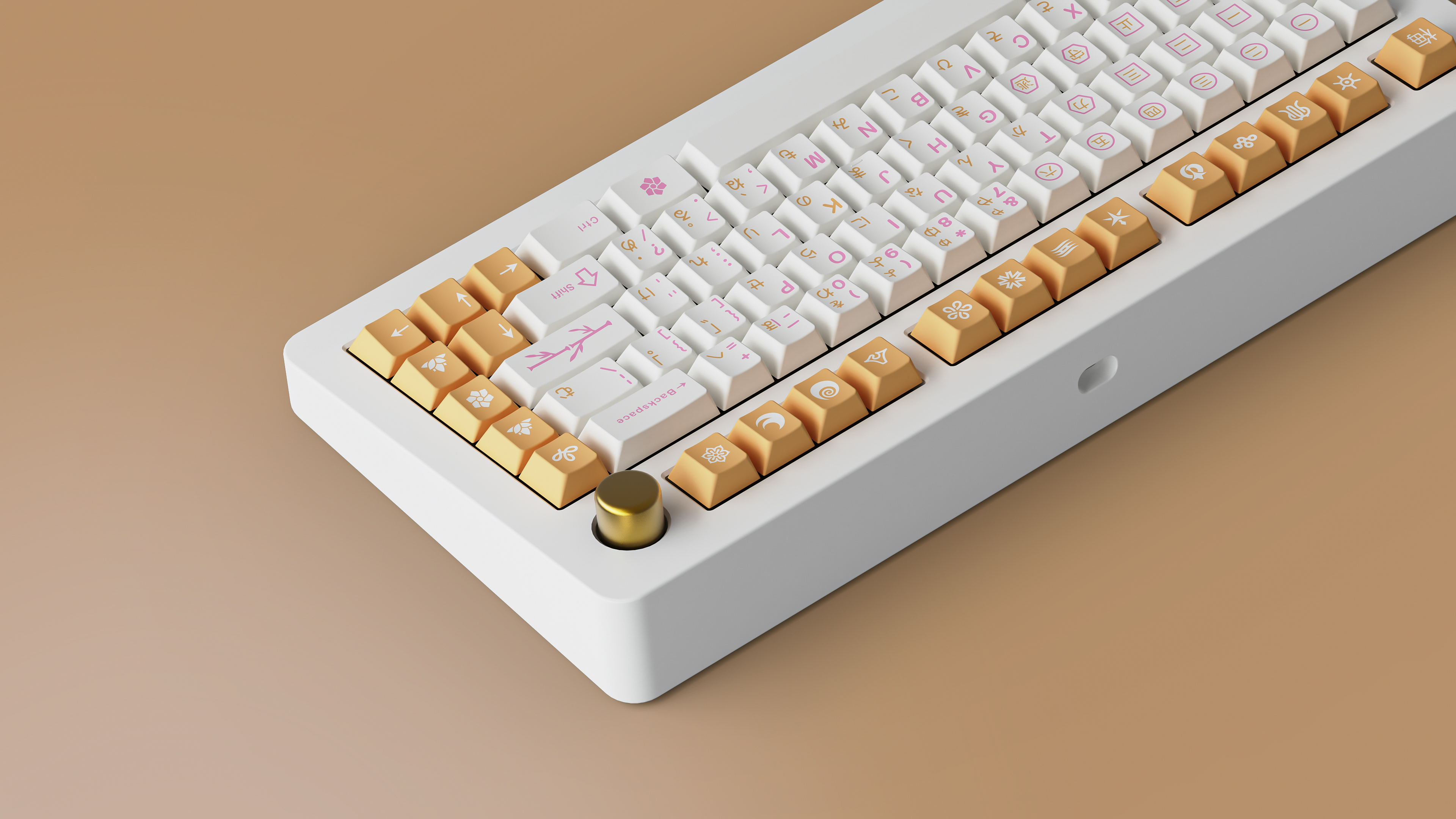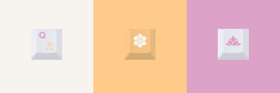 Taking inspiration from the ume blossom, a yellow-gold is chosen for the hiragana sublegends and accent key color.