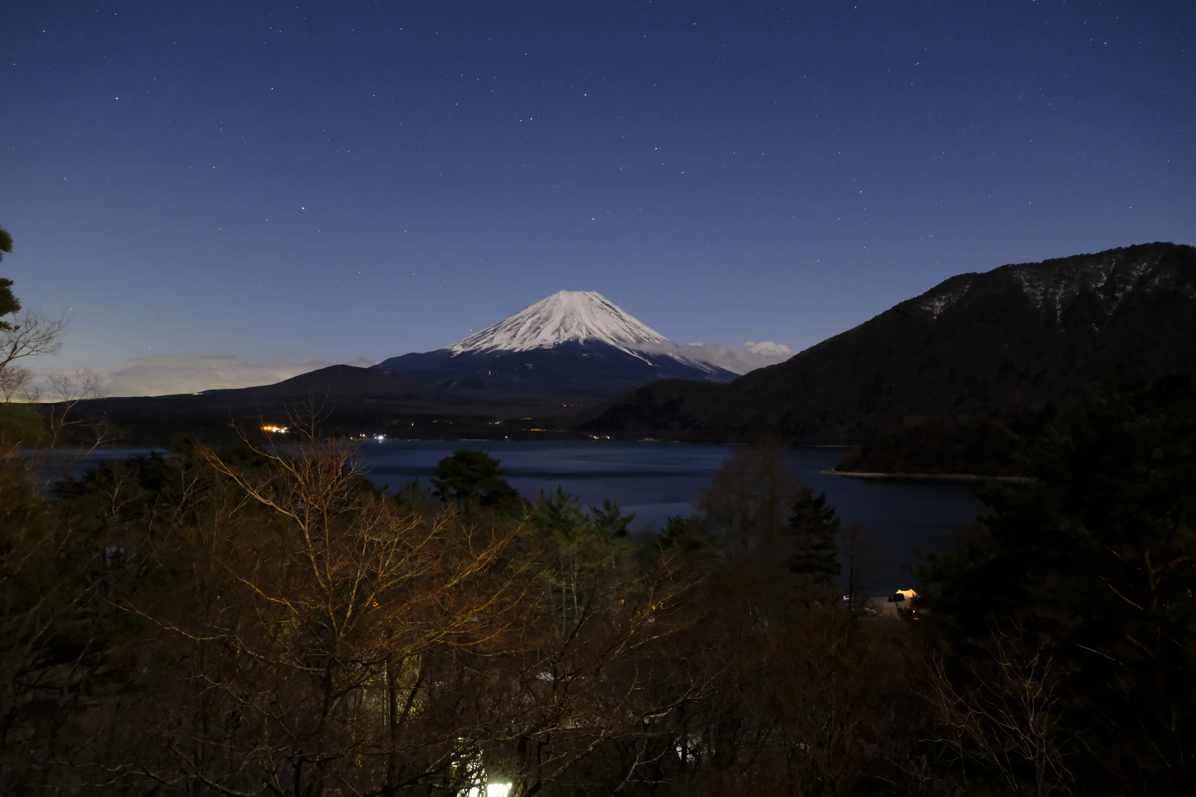 Although I arrived at Hōan (the place where Nadeshiko falls asleep in the first episode of the first season of Yuru Camp; besides the campsite, there are also accommodations there) at around eight or nine in the evening, the moonlit lake and the campfire below gave me a feeling of "Ah, is this what a pilgrimage feels like?"