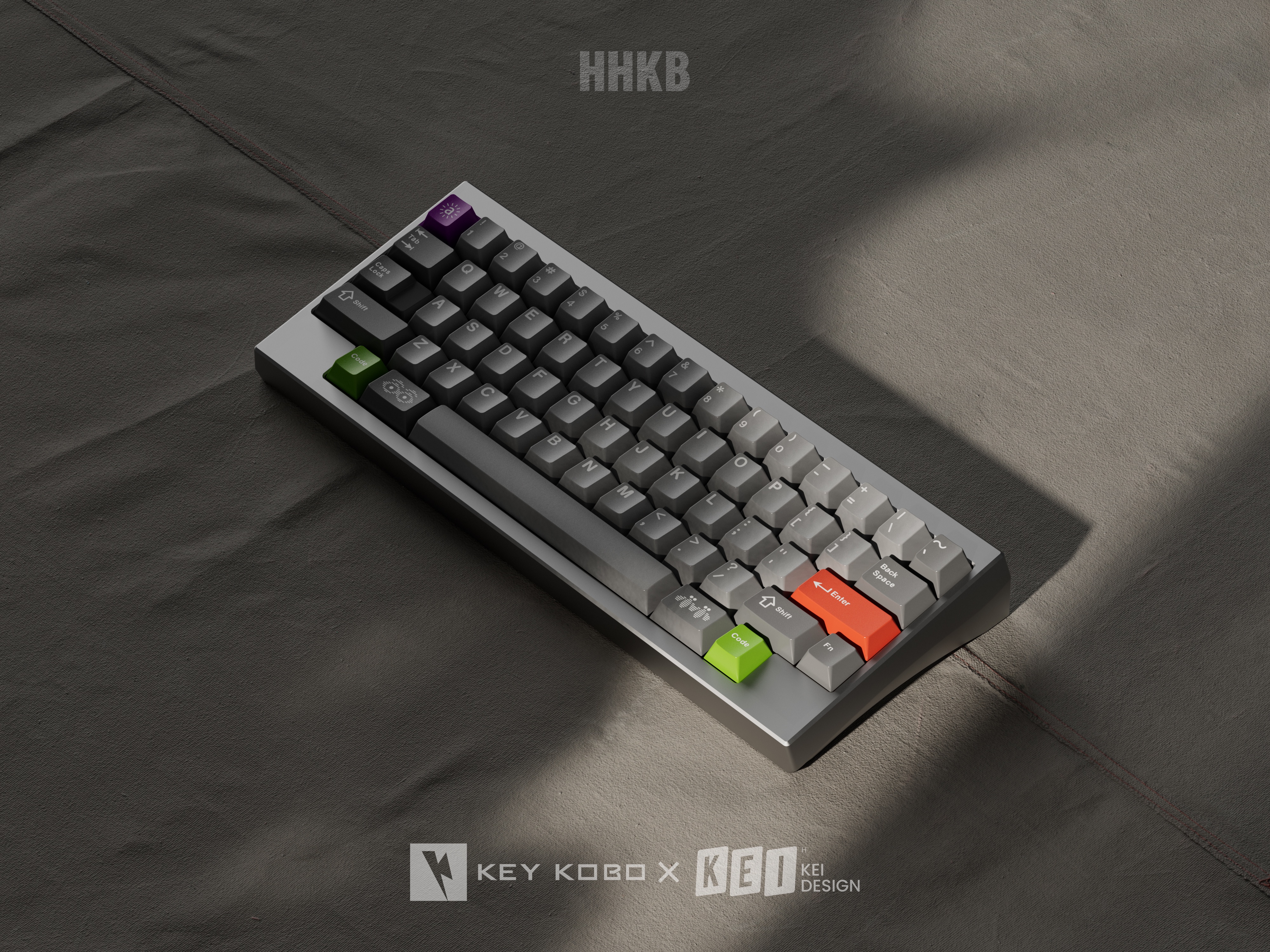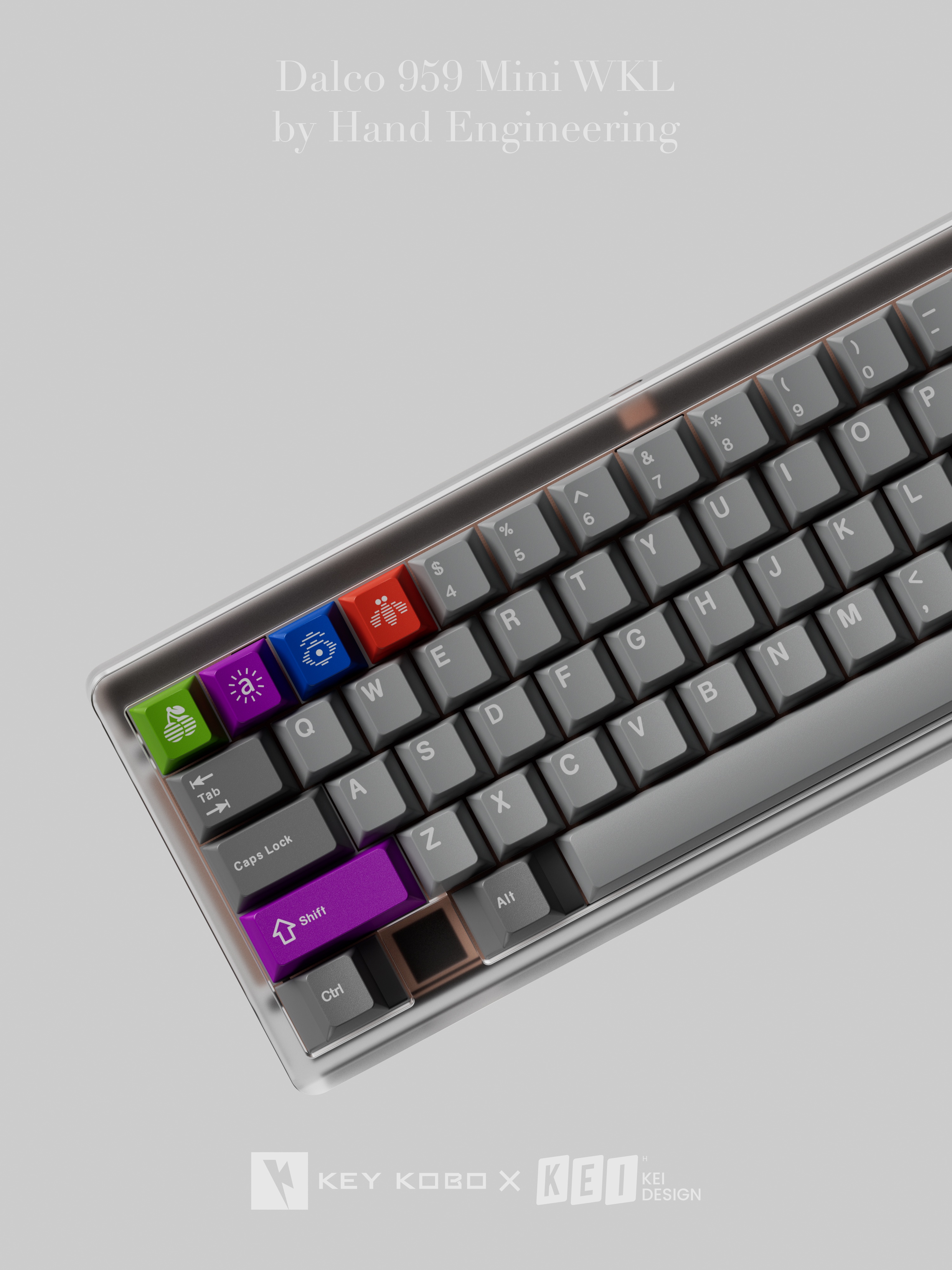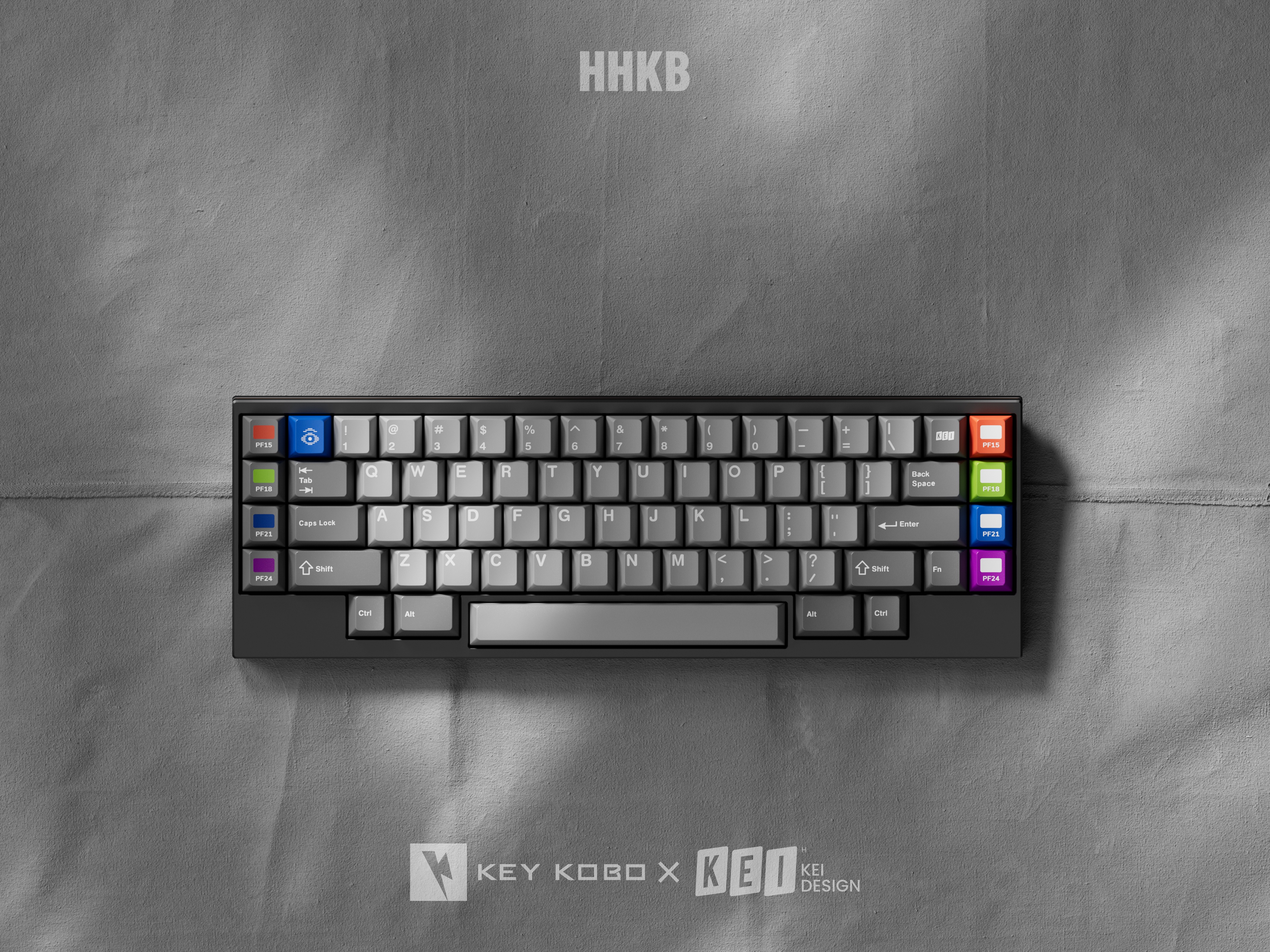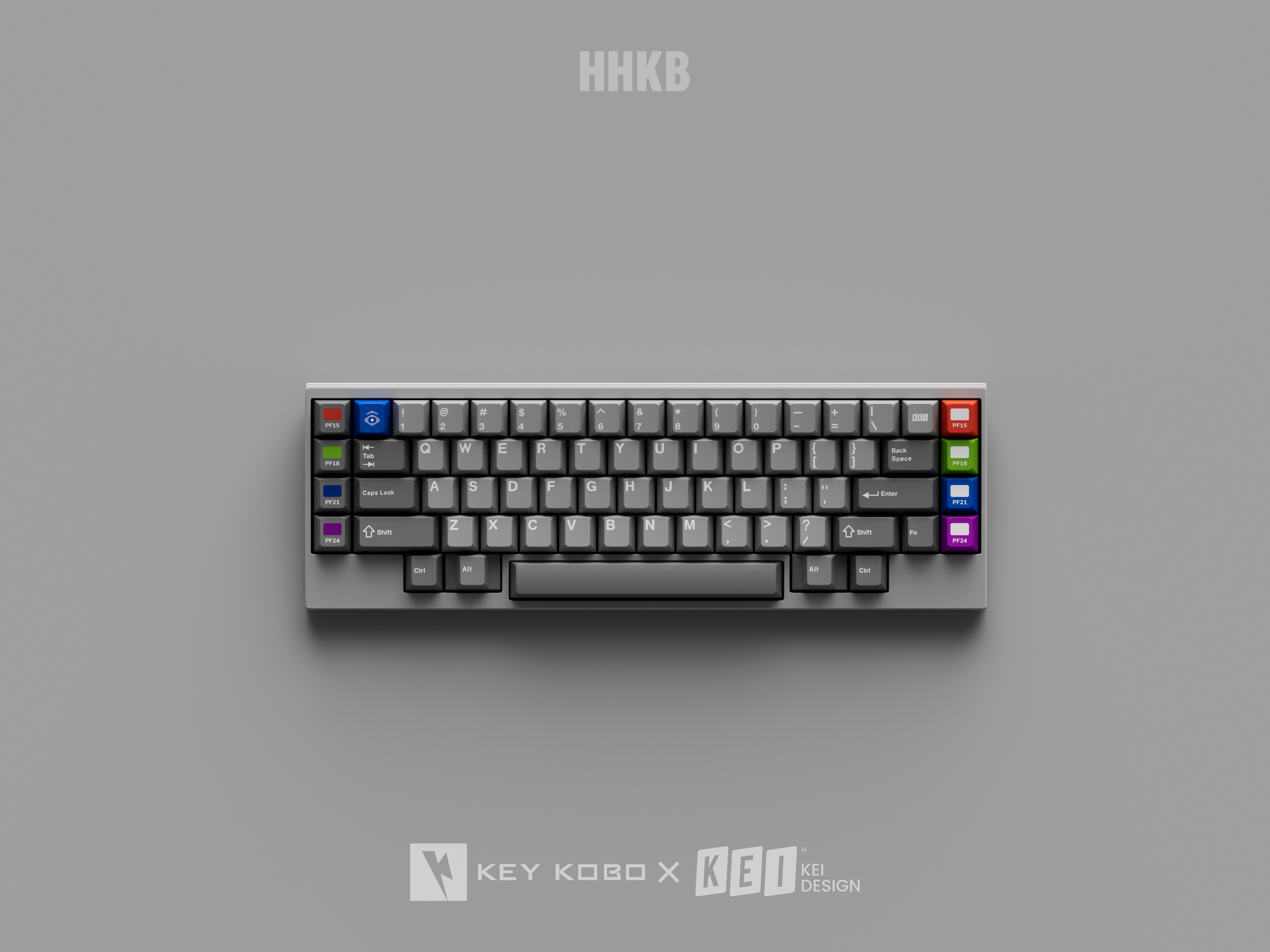 The primary colours use light grey and dark grey and then absorb five fusion colours from IBM (similar to the riso colour style) for reorganization and matching. Exciting and unique stepped CTRL and alt keys are added to the design. Thank you, keykobo for your support and the time and effort to open a separate mould