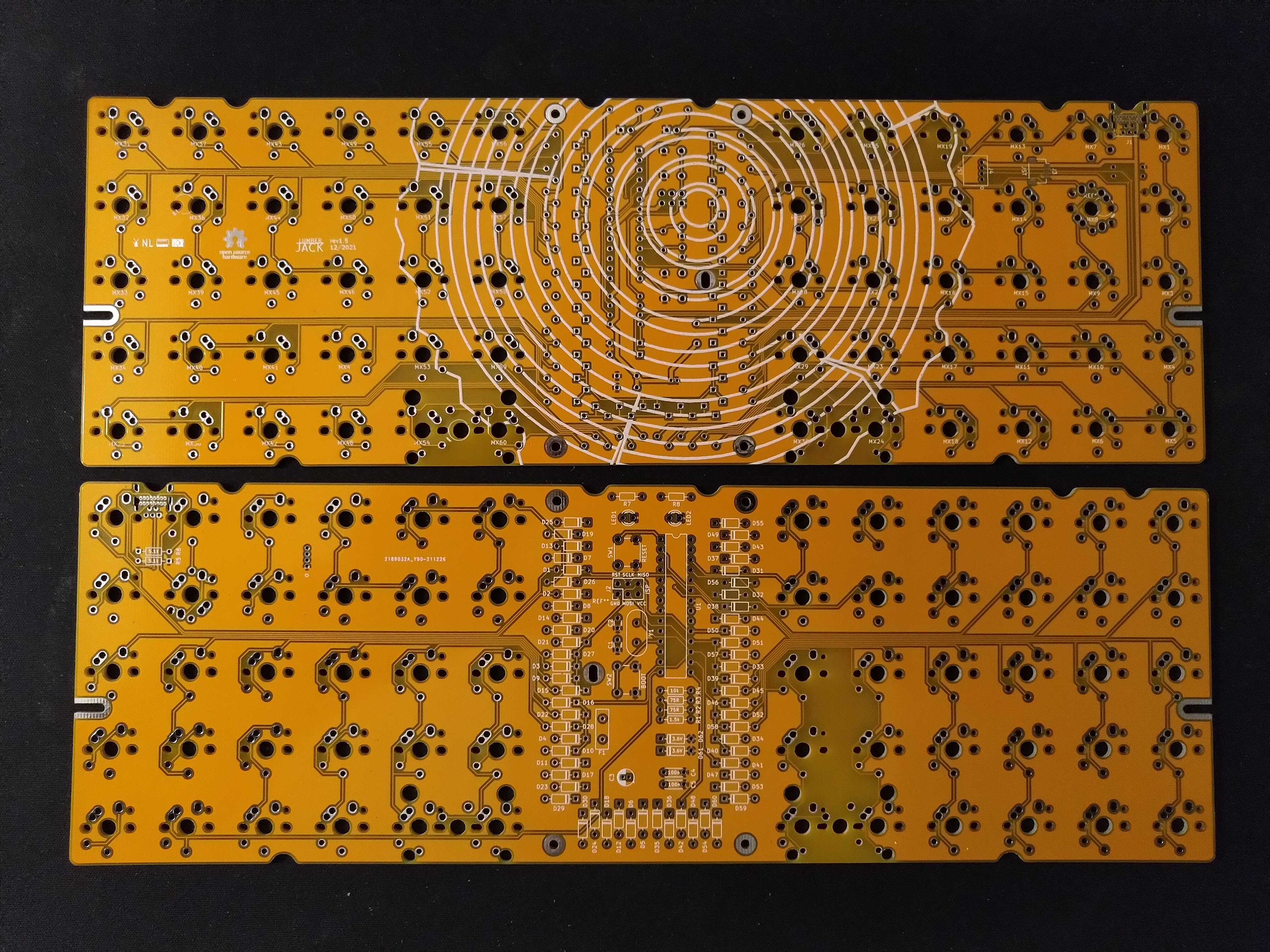 https://github.com/peej/lumberjack-keyboard/blob/master/guide.md* All new wood themed soldermask on the underside