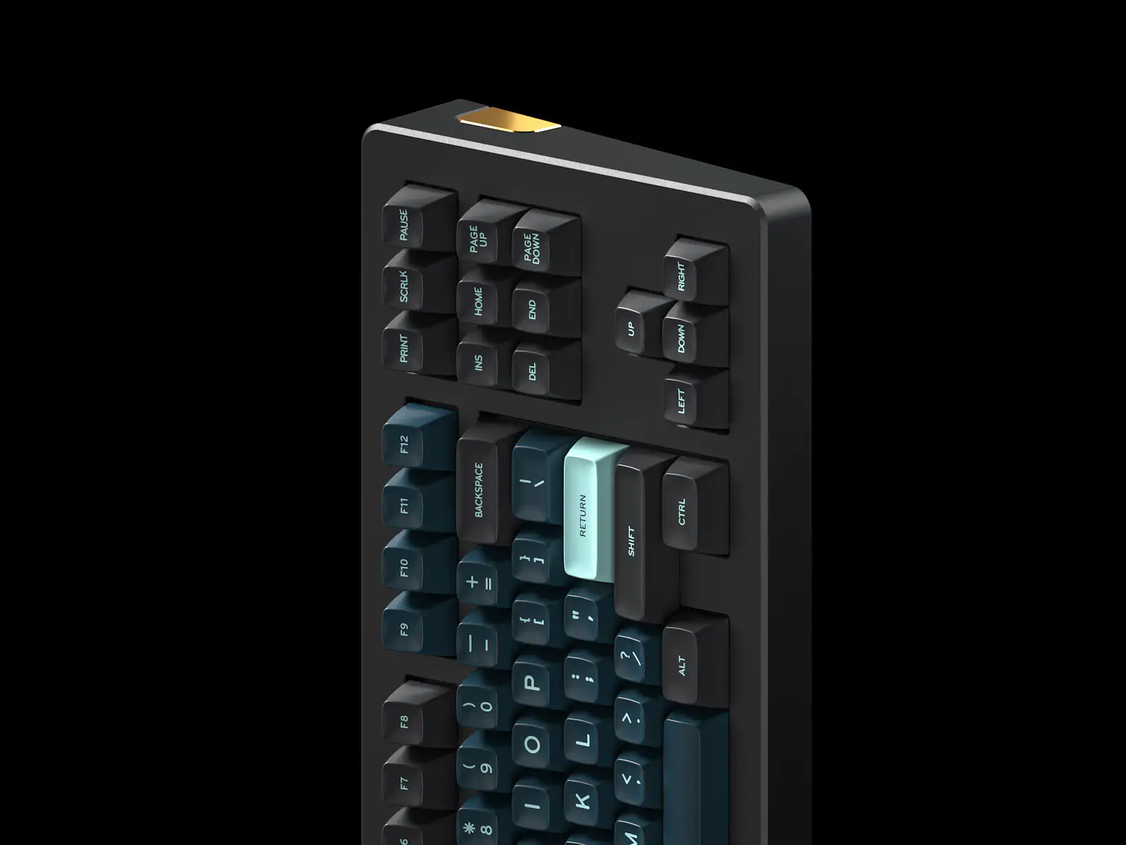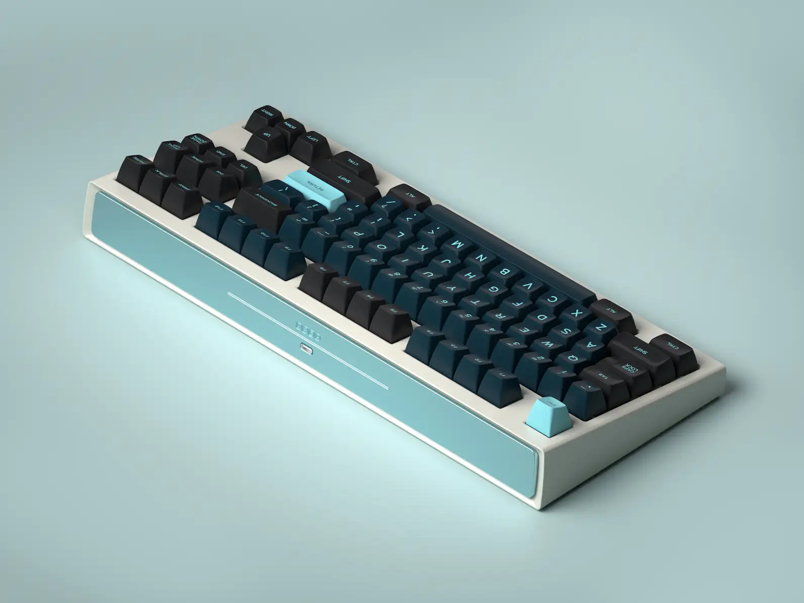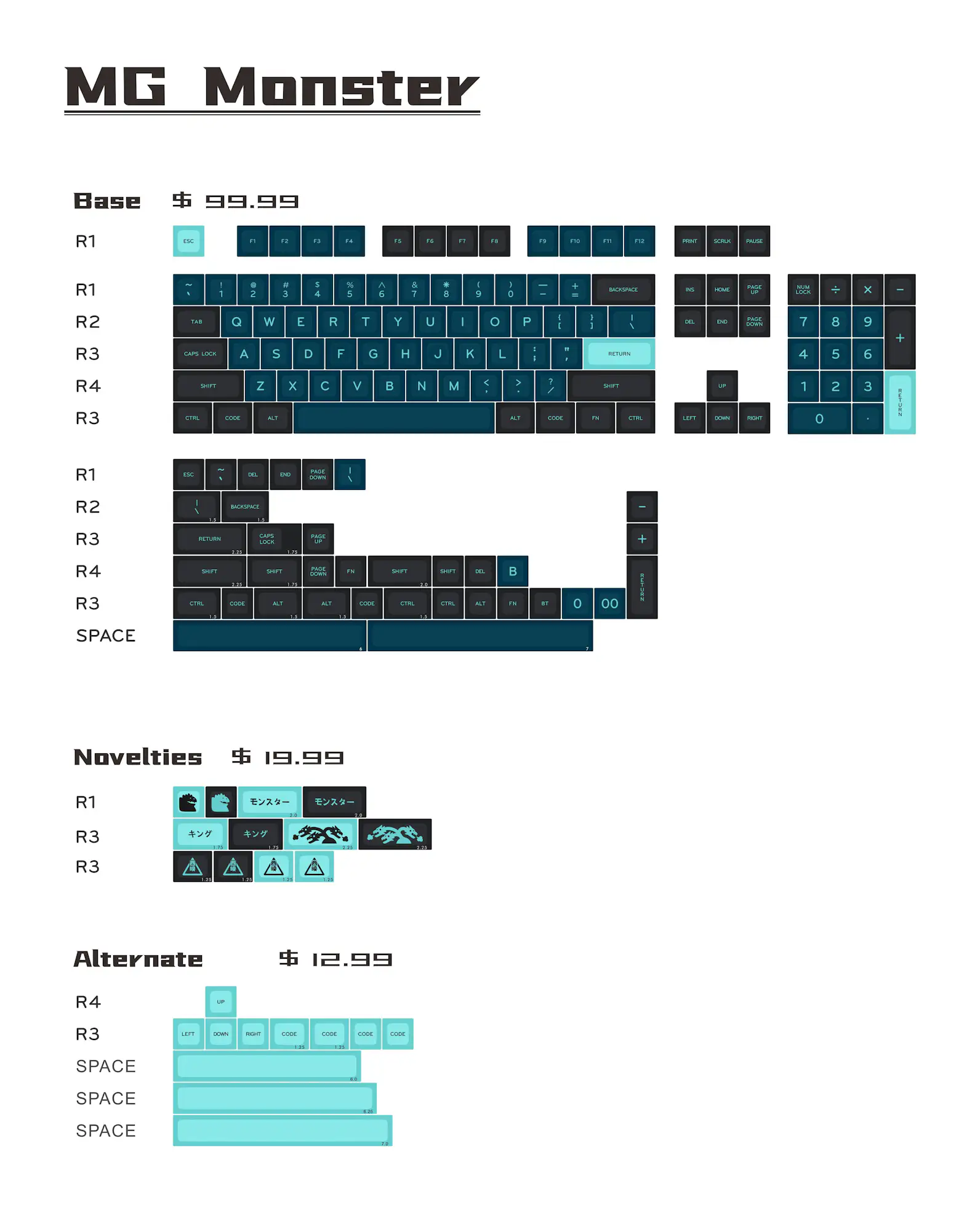 The colour way and theme were inspired by the film Hollywood version "Godzilla", dark tone keycaps with light blue fonts make this set of keycaps have a sense of mystery and also I created two cute monsters in the novelties kit, glad you guys will like them.