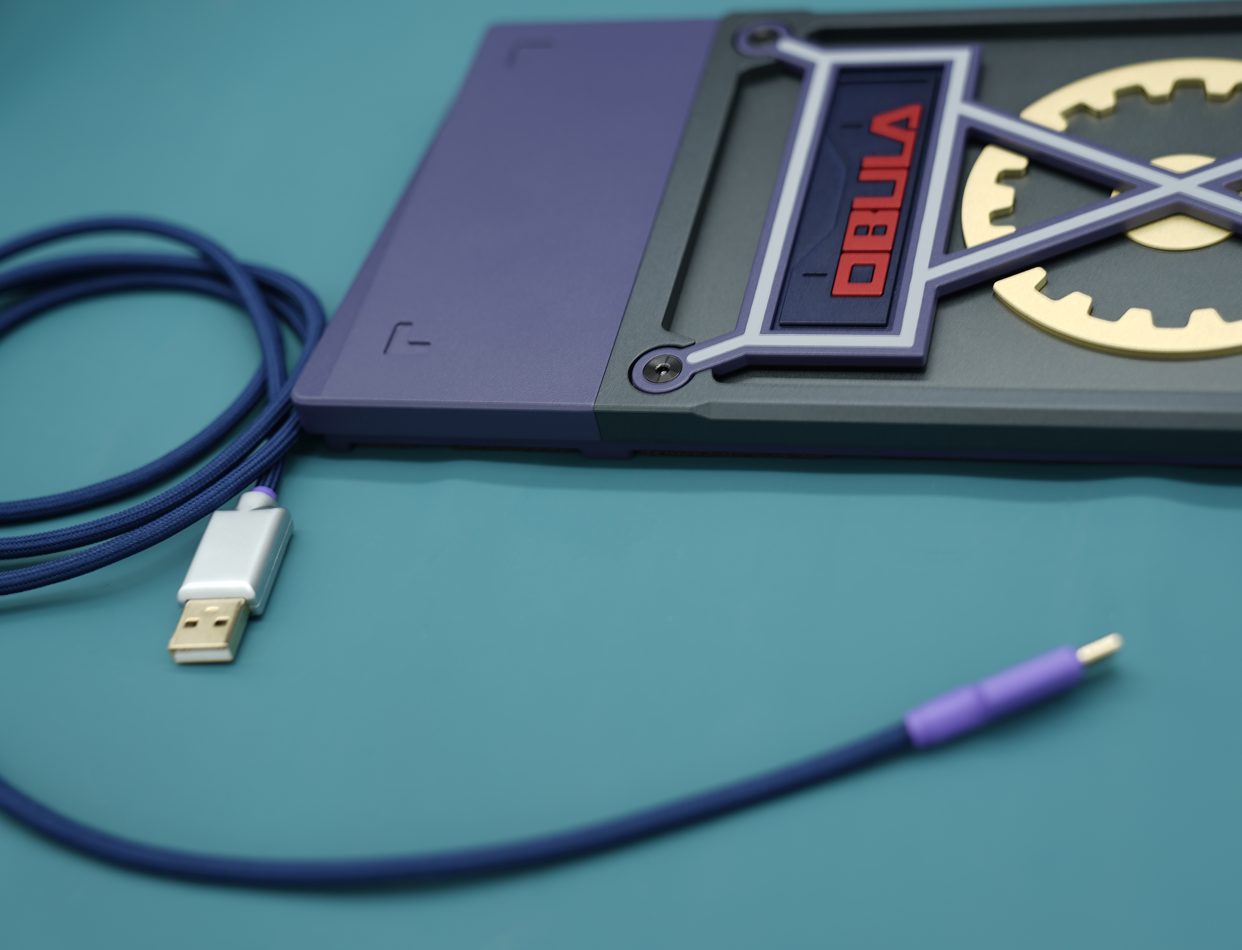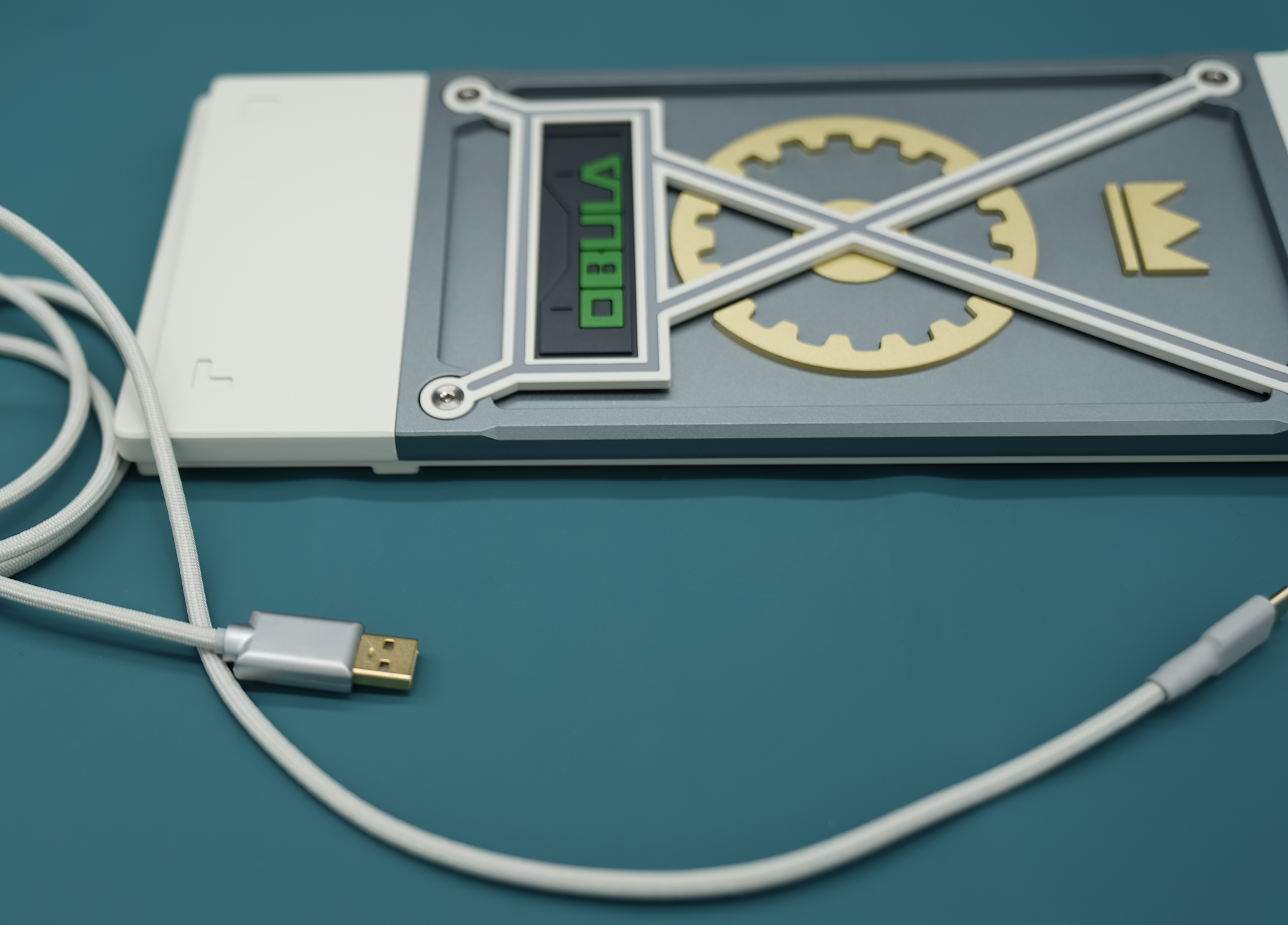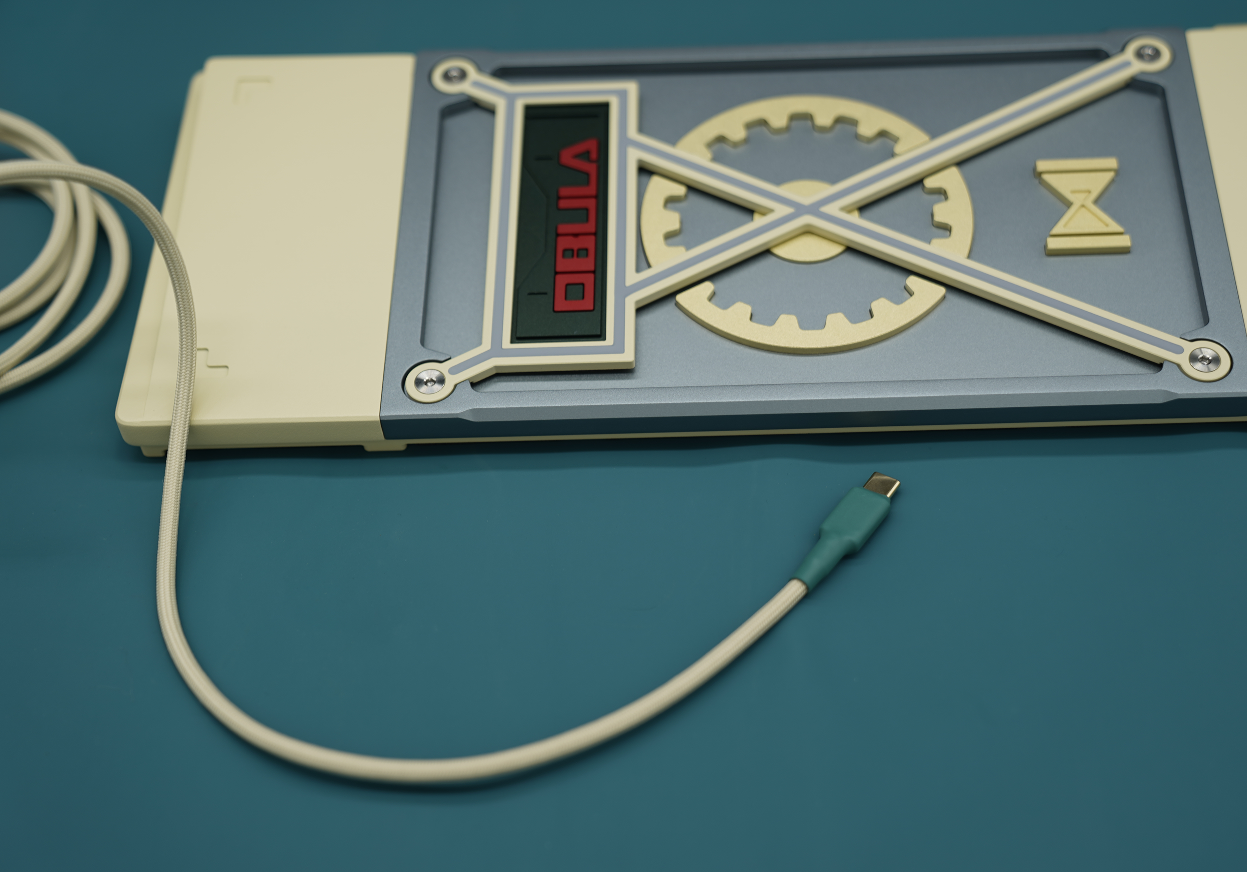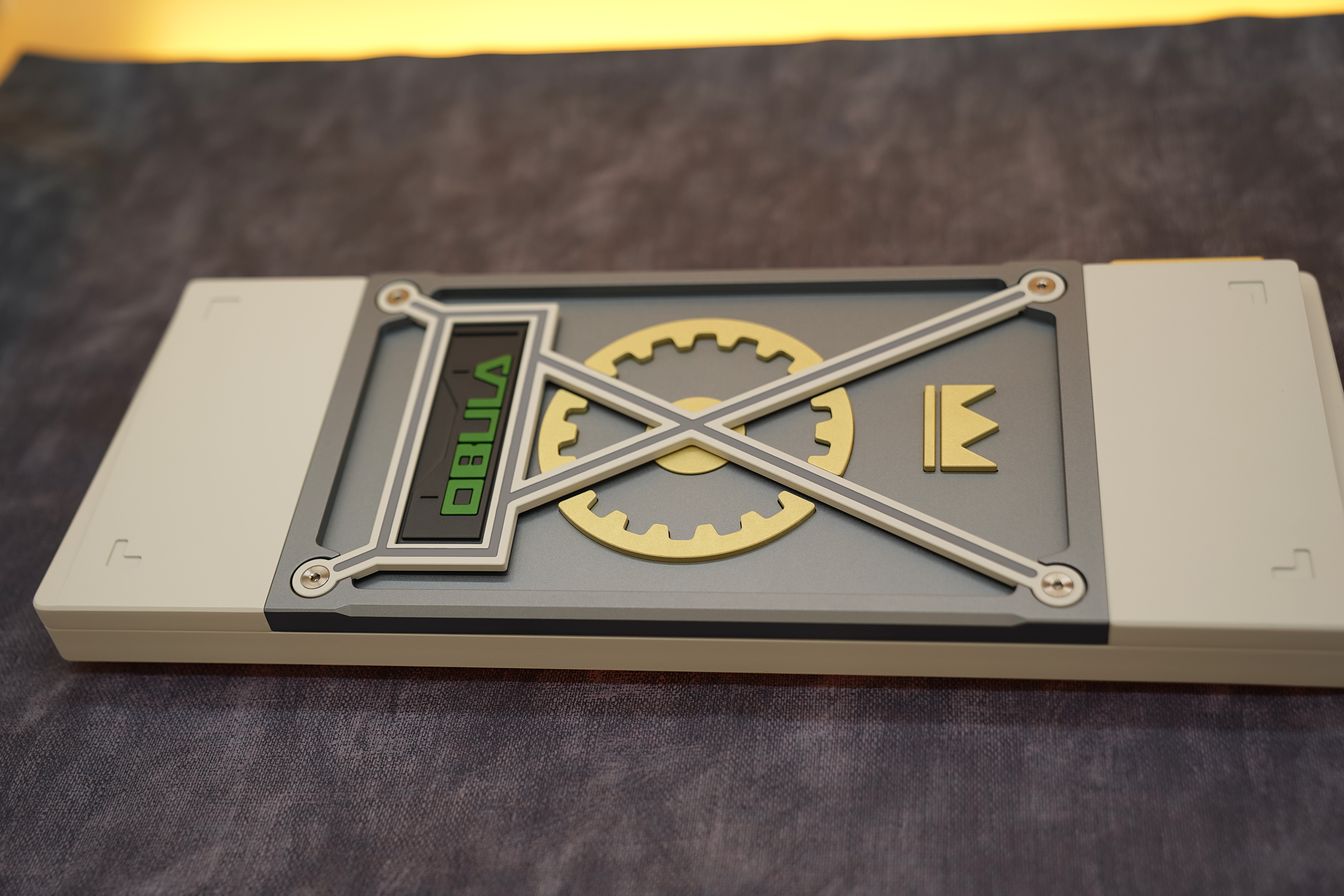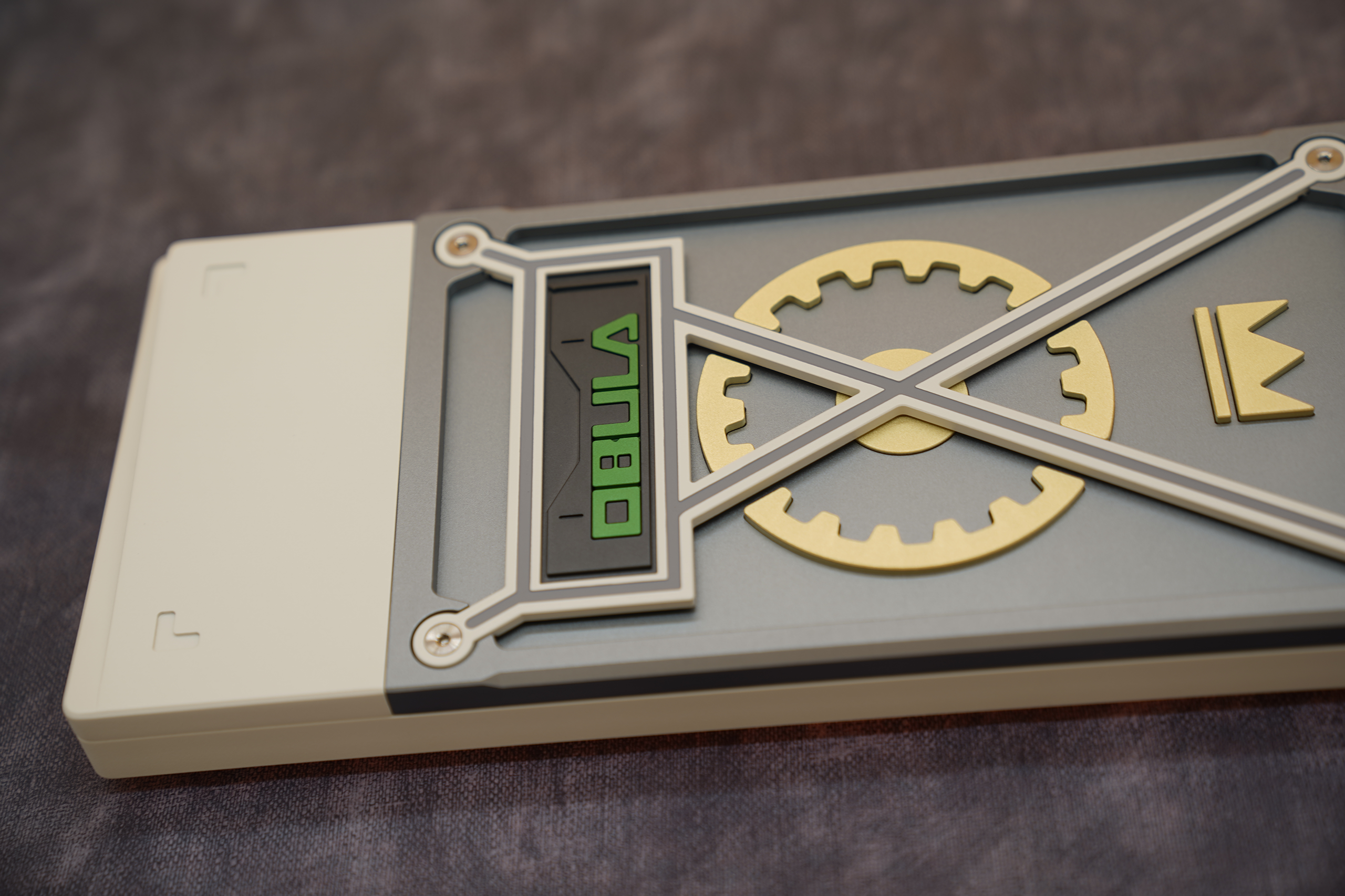 We decided to go with a montage style exterior design. This style is to highlight the unique weight and badge design on the bottom of the keyboard. We came up with different brass weight designs to show uniqueness for each mobula 80. The huge gear shaped weight, thick bezels, and other brass strips have all reinforce the industrial style of mobuda 80.