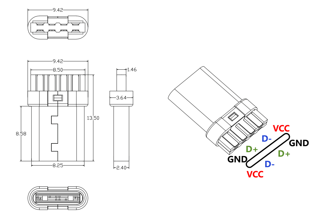 3. USB connector wiring. The wires of the female connector side have been pre-soldered. You'll need to solder the side of the male connector of your choice, either USB Mini or USB C. The following is the diagram.