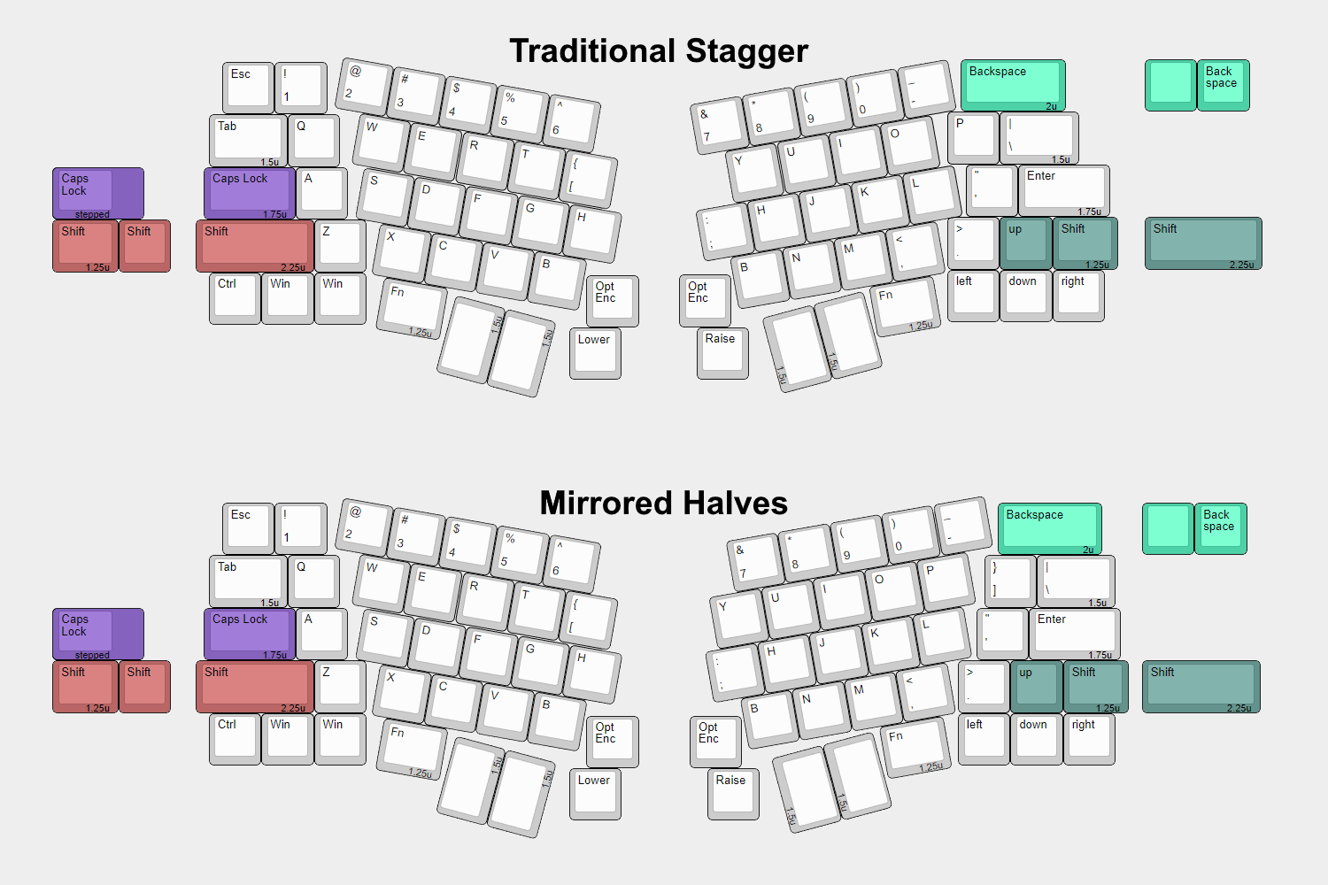 When purchasing the Mokulua, it is available as a mirrored split where the right half is changed up some with an unusual stagger, or a more traditional split right half that is in line with the stagger you expect from an Alice.