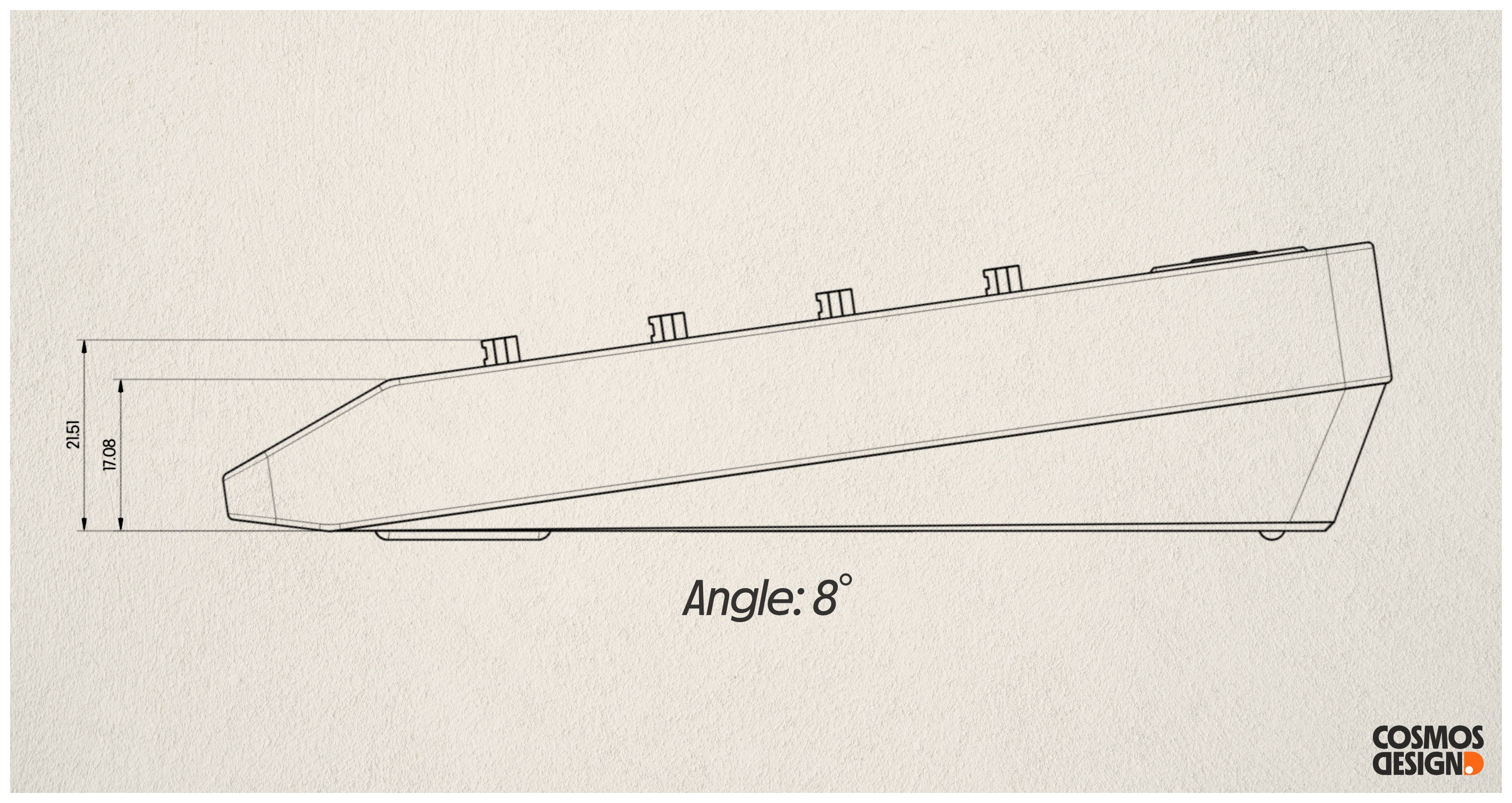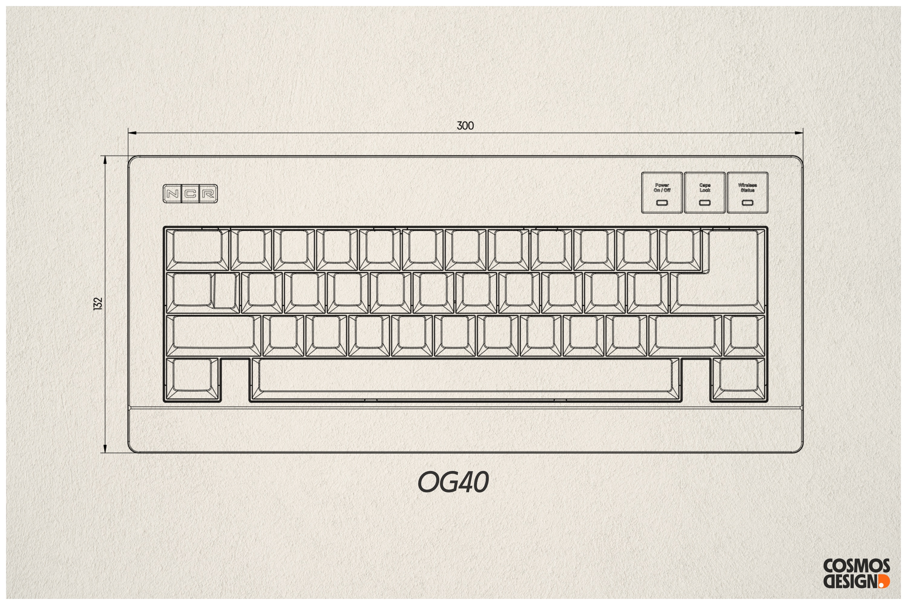With its 14U design and wide bezels, the OG40 aligns closely with standard 60% keyboard dimensions. To prevent proportional imbalance that can arise from direct scaling, we drew inspiration from Panasonic KX-E8283: extending the lower edge while maintaining the original forehead and side bezels, which creates smooth transitions to the Cherry MX lips and ensures a harmonious balance in width across all four sides.