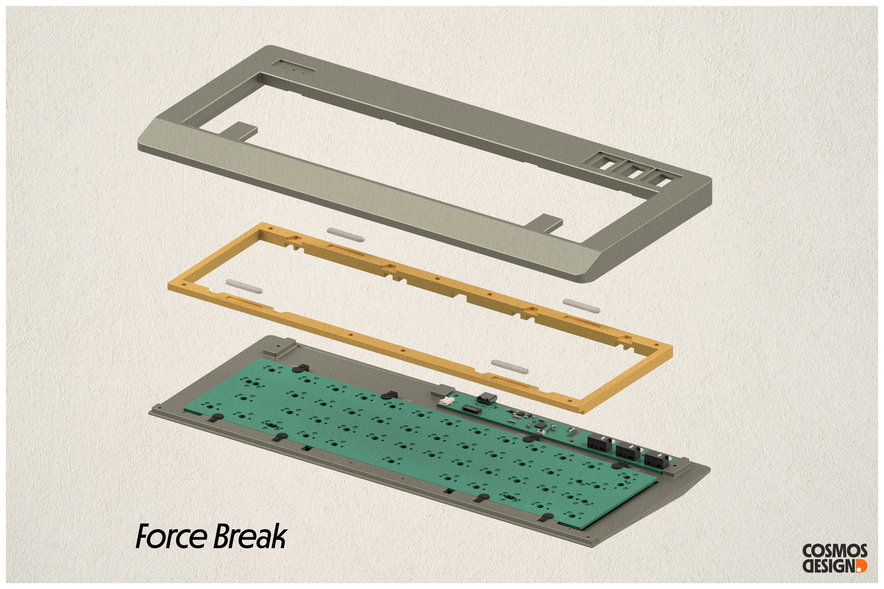 6. A metal frame has been introduced to accommodate complex layout compatibility and various mounting styles. It features a Force Break slot and utilizes footpads to isolate vibrations. Considering the varying density and damping properties of different materials, this hybrid configuration effectively reduces resonance during key presses. Brass has been selected as the material for the frame due to its superior performance in this context.