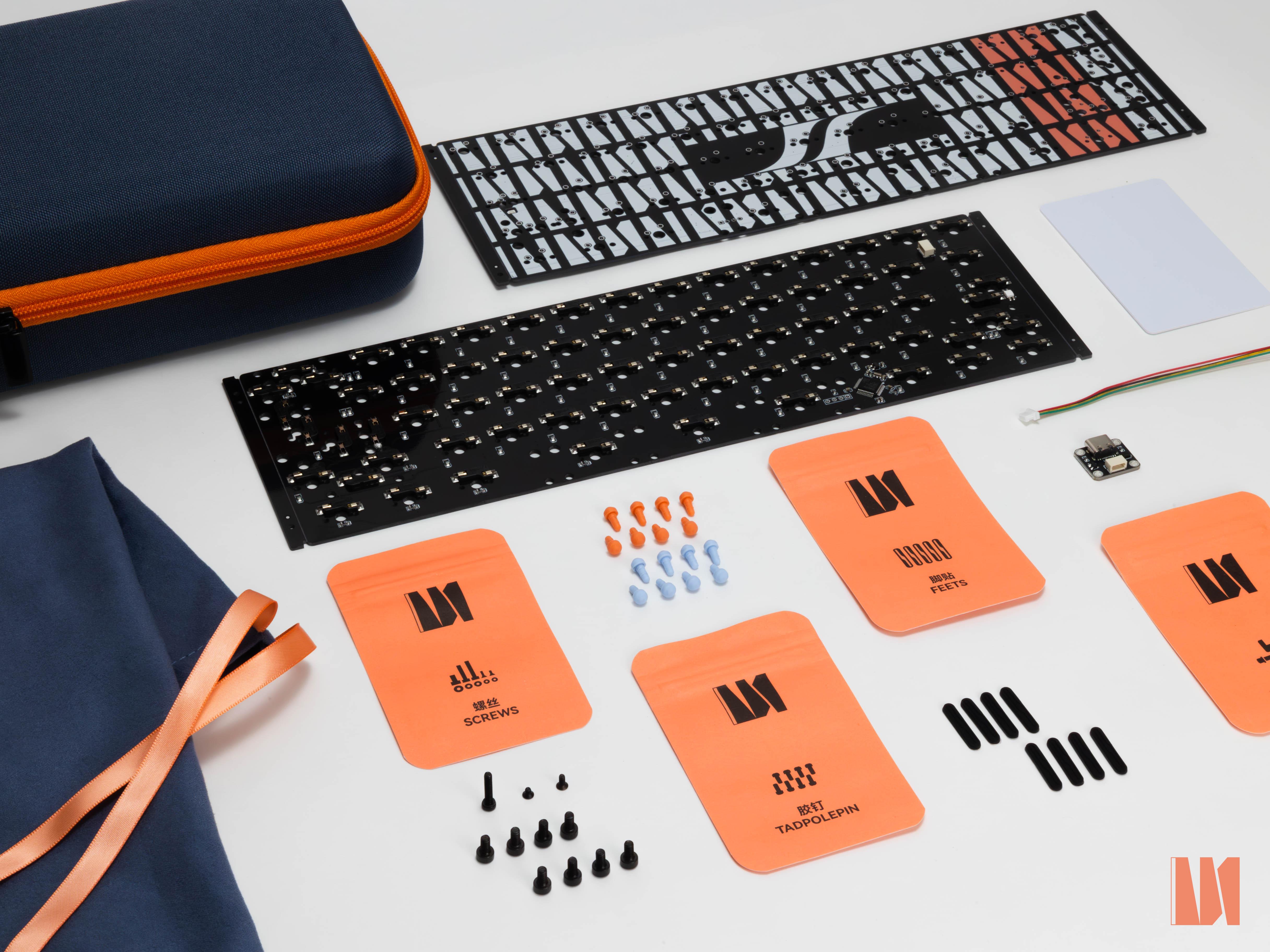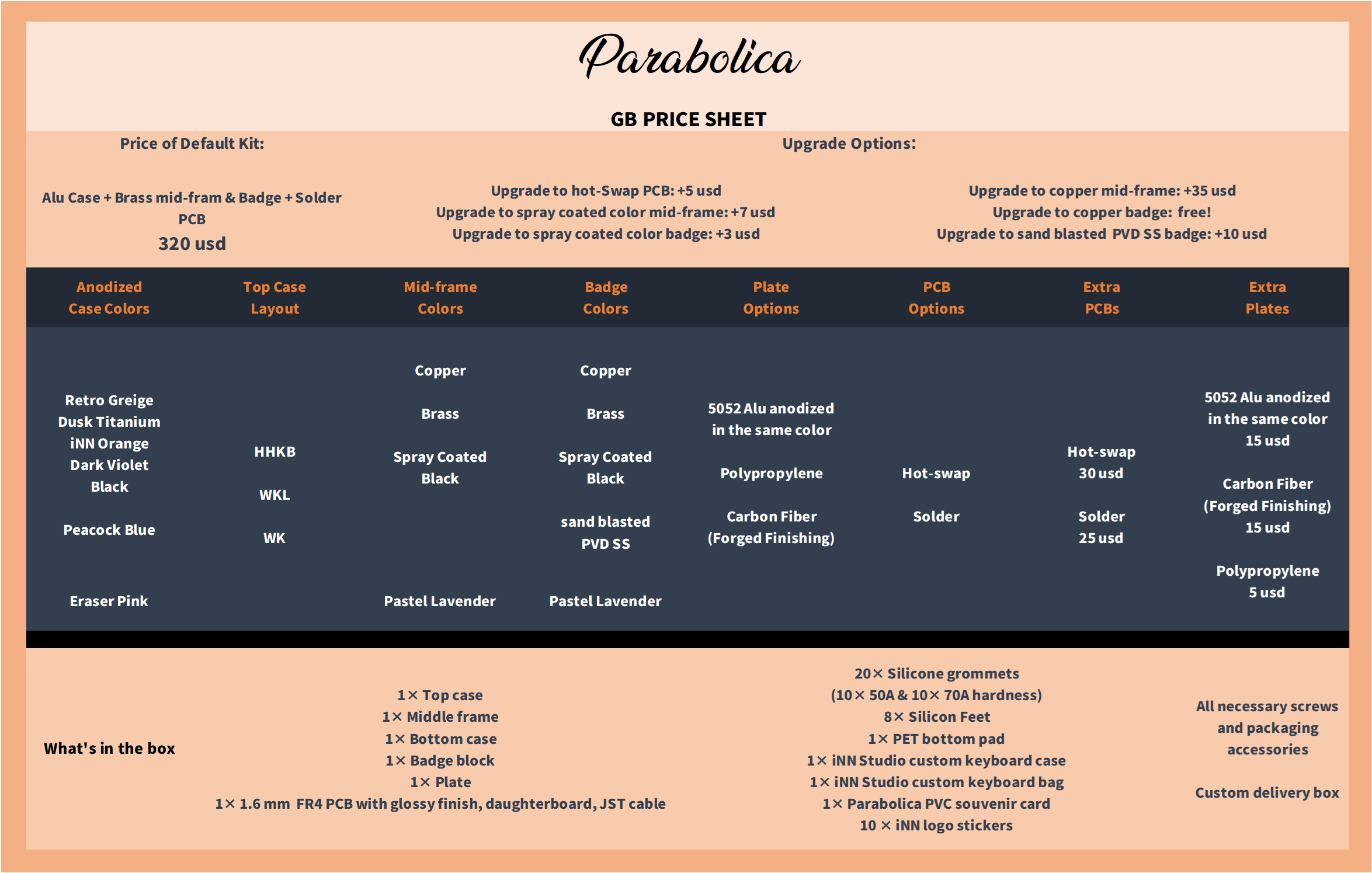Parts included in the Default kit: Can be upgraded: 1× Anodized Aluminum Top Case of your color choice 1× Anodized Aluminum Bottom Case of your color choice 1× Brass With Nano anti-oxidation Coating Badge Default: 1× Aluminum/ Carbon Fiber Full Plate 1× 1.6mm PCB with black varnish surface with iNN Orange UVed logos 1× Unified C Series DB & JST connect cables 20× Silicone Tadpolepins 50A & 70A (10 Each) 8× Silicone feets 1× PET bottom pads 1× iNN Studio exclusive keeb case 1× iNN Studio exclusive velvet keeb bag 1× Parabolica PVC souvenir card & Post 1 x Brass With Nano anti-oxidation Coating Mid-frame All Screws and Packging