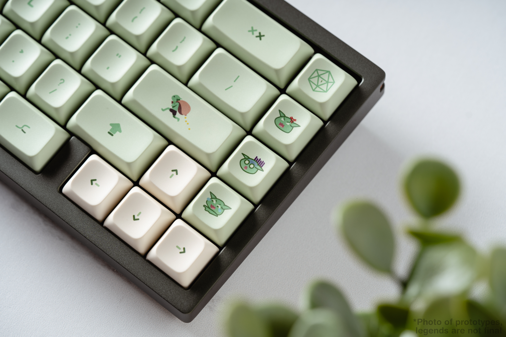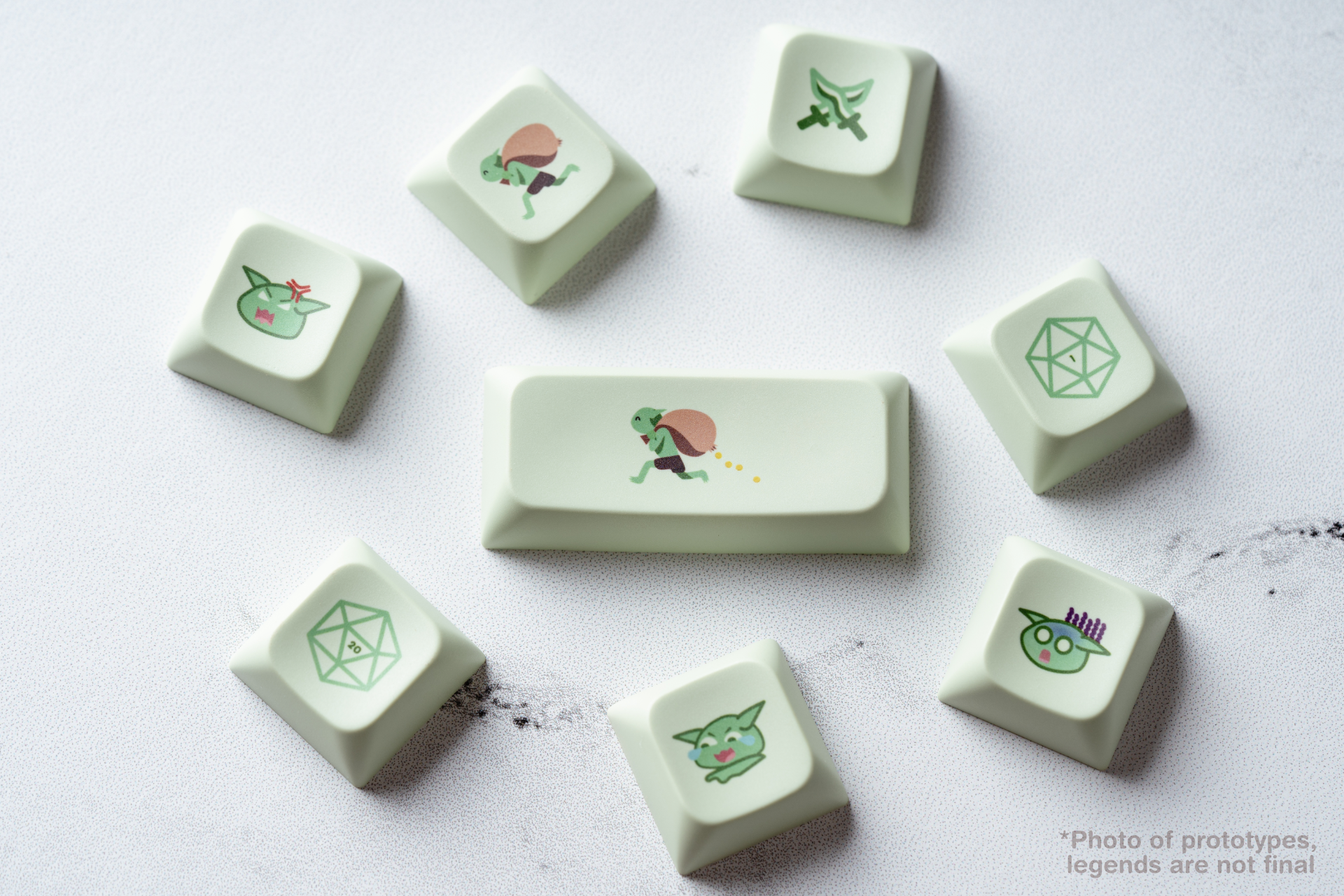 Photos Sample photos! You may notice some legend errors- these are prototype keys that were made for color accuracy and so I could see the quality of dyesub. Please refer to the above kit image for the current legends, legend sizes, and legend alignment! Example changes- ! and ? were slightly scaled up and the enter novelty is centered based on the goblin itself rather than the entire legend.