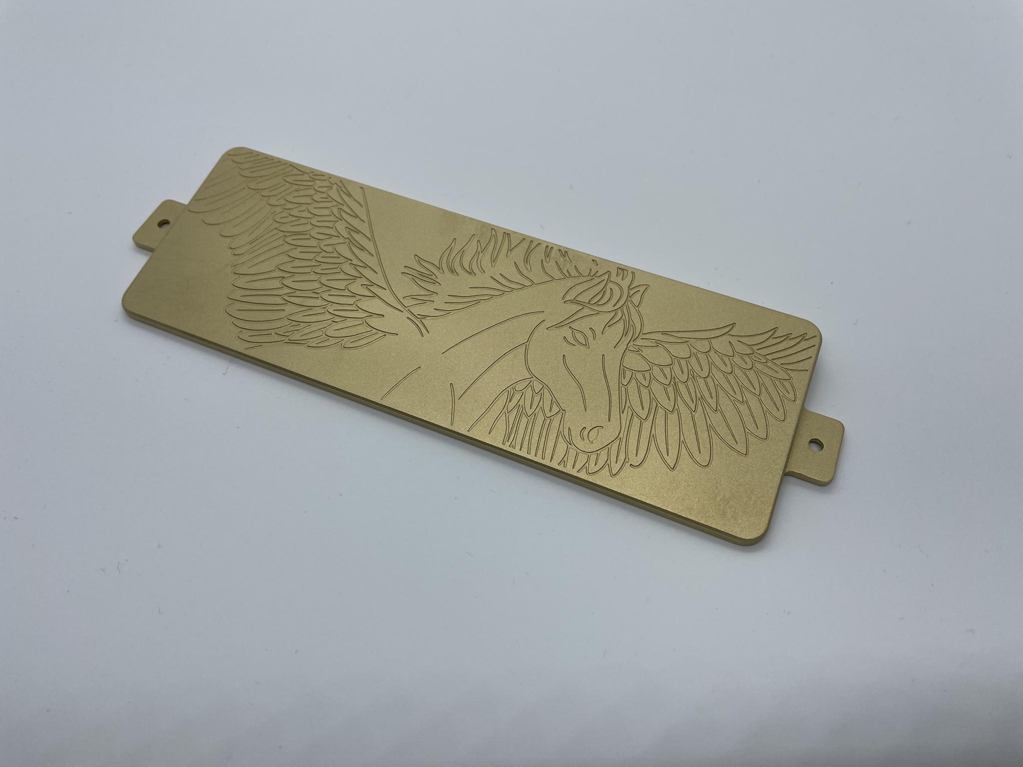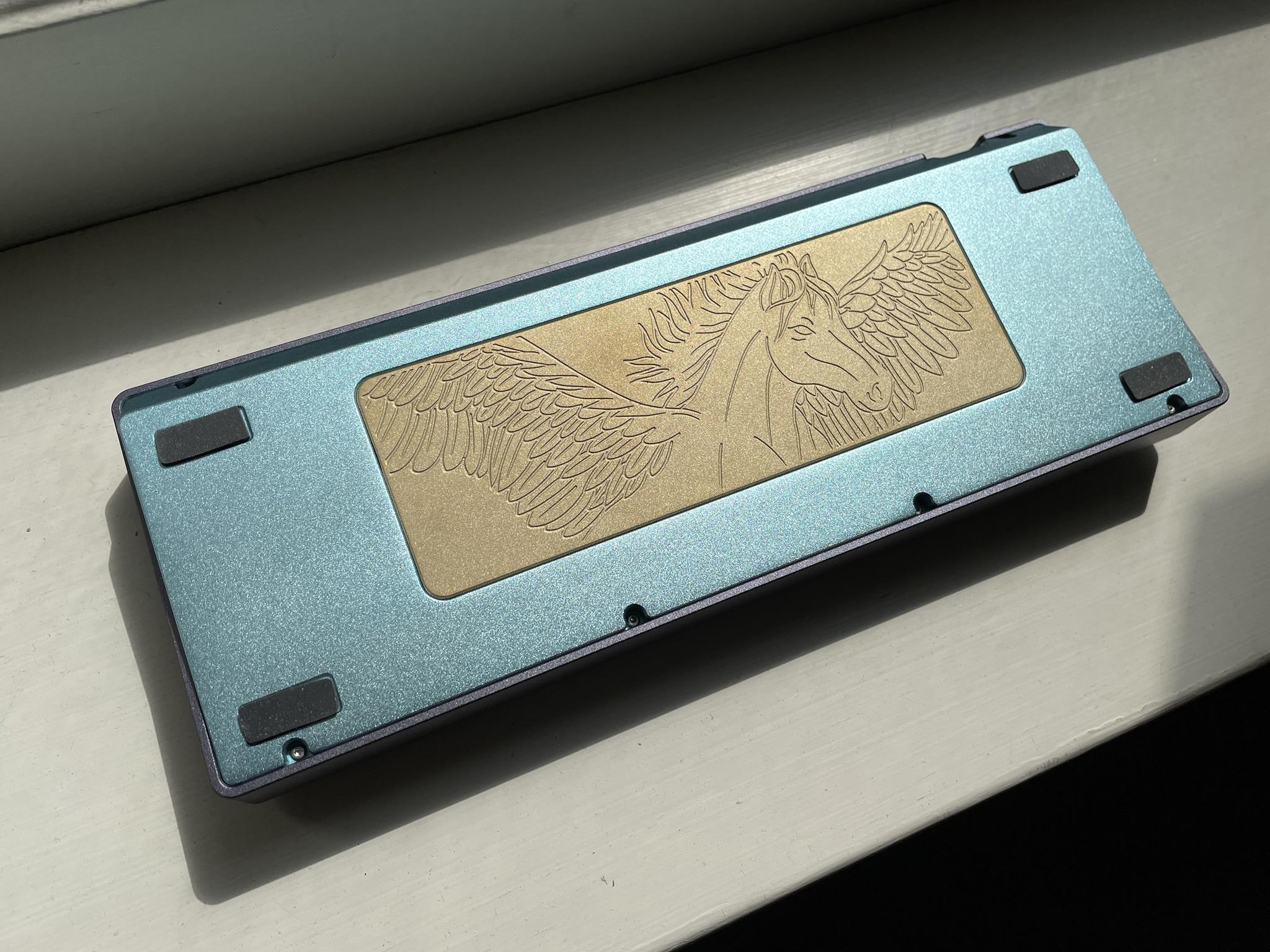 The weight is laser engraved with Pegasus which is the namesake of the keyboard. Weight material will be either brass or polished stainless steel (TBD).