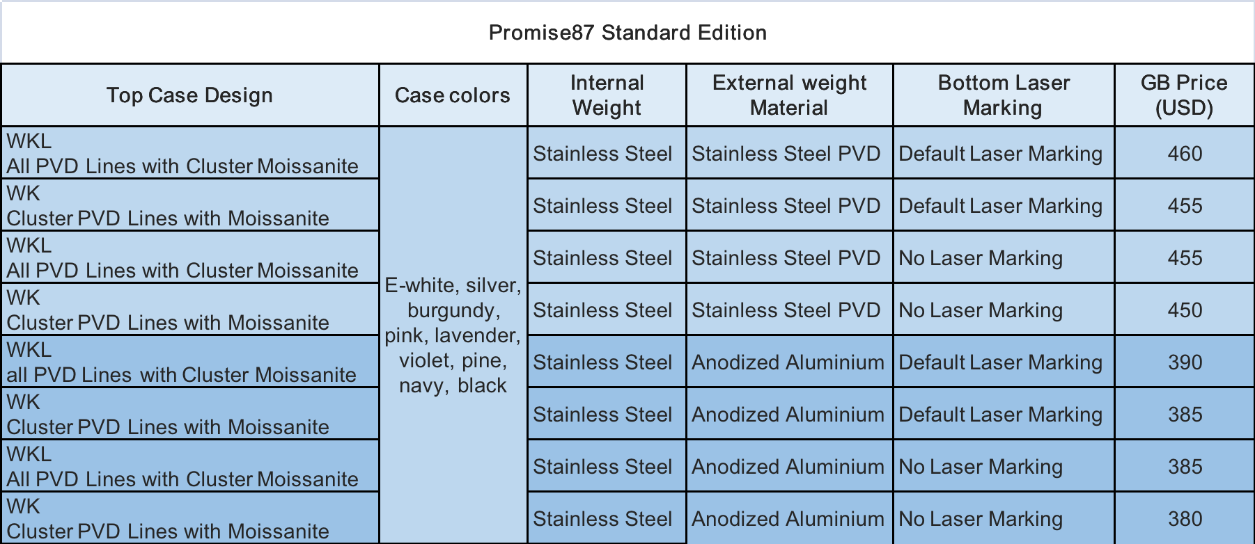 Promise87 Bespoke Price List 80USD more based on different standard edition variations (SS or Alu outer weight, with or without PVD lines, Laser marking).