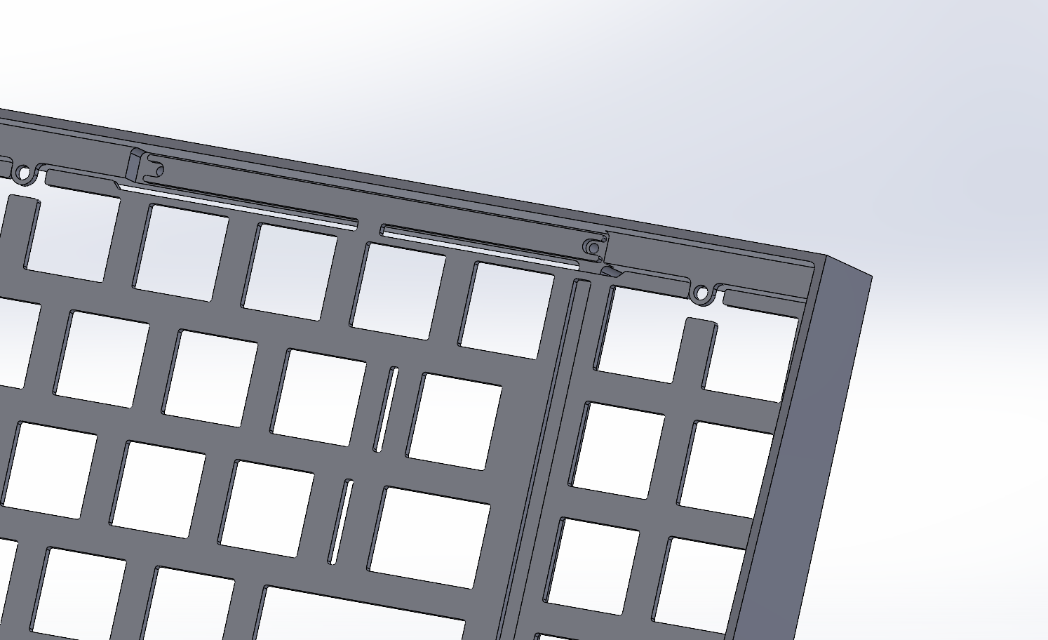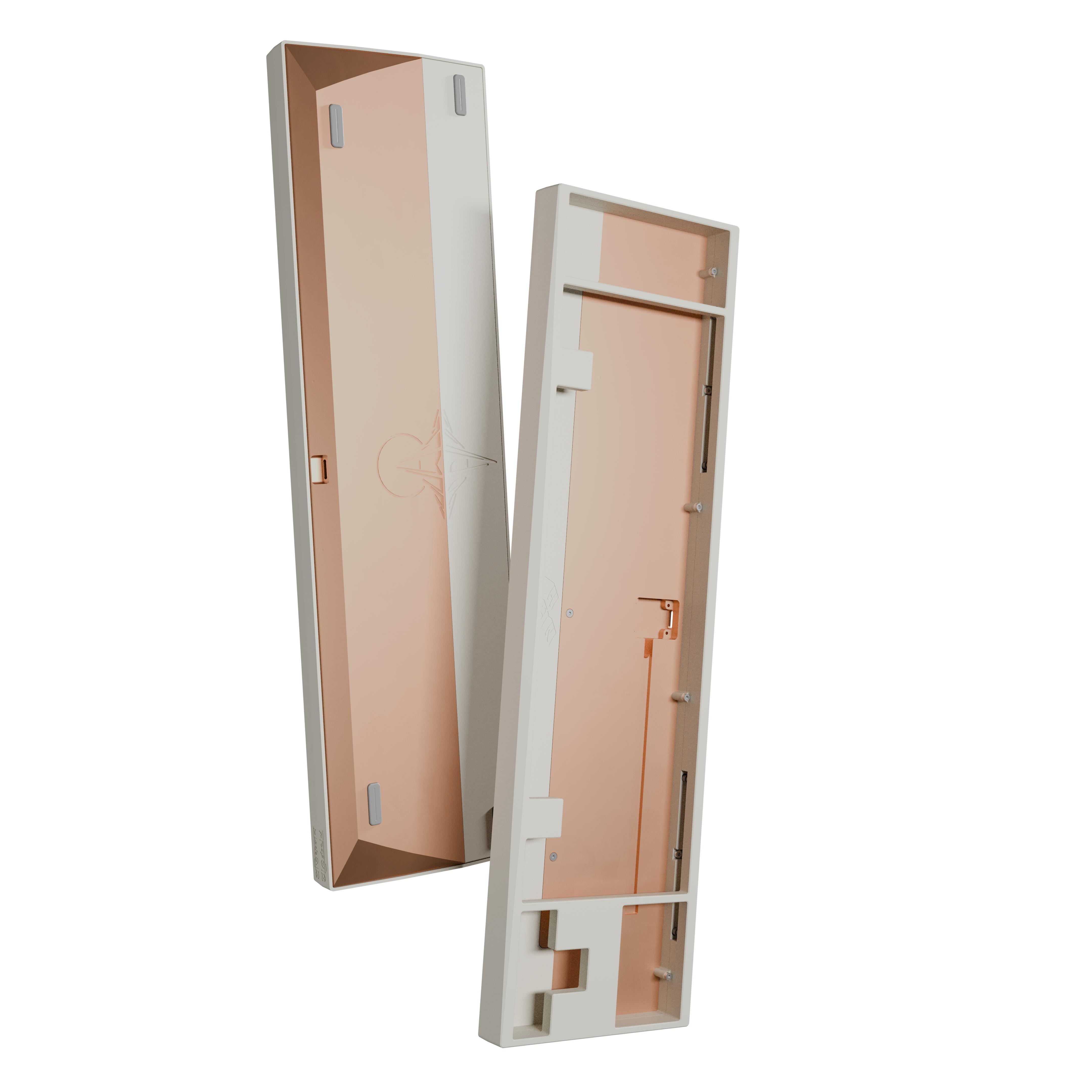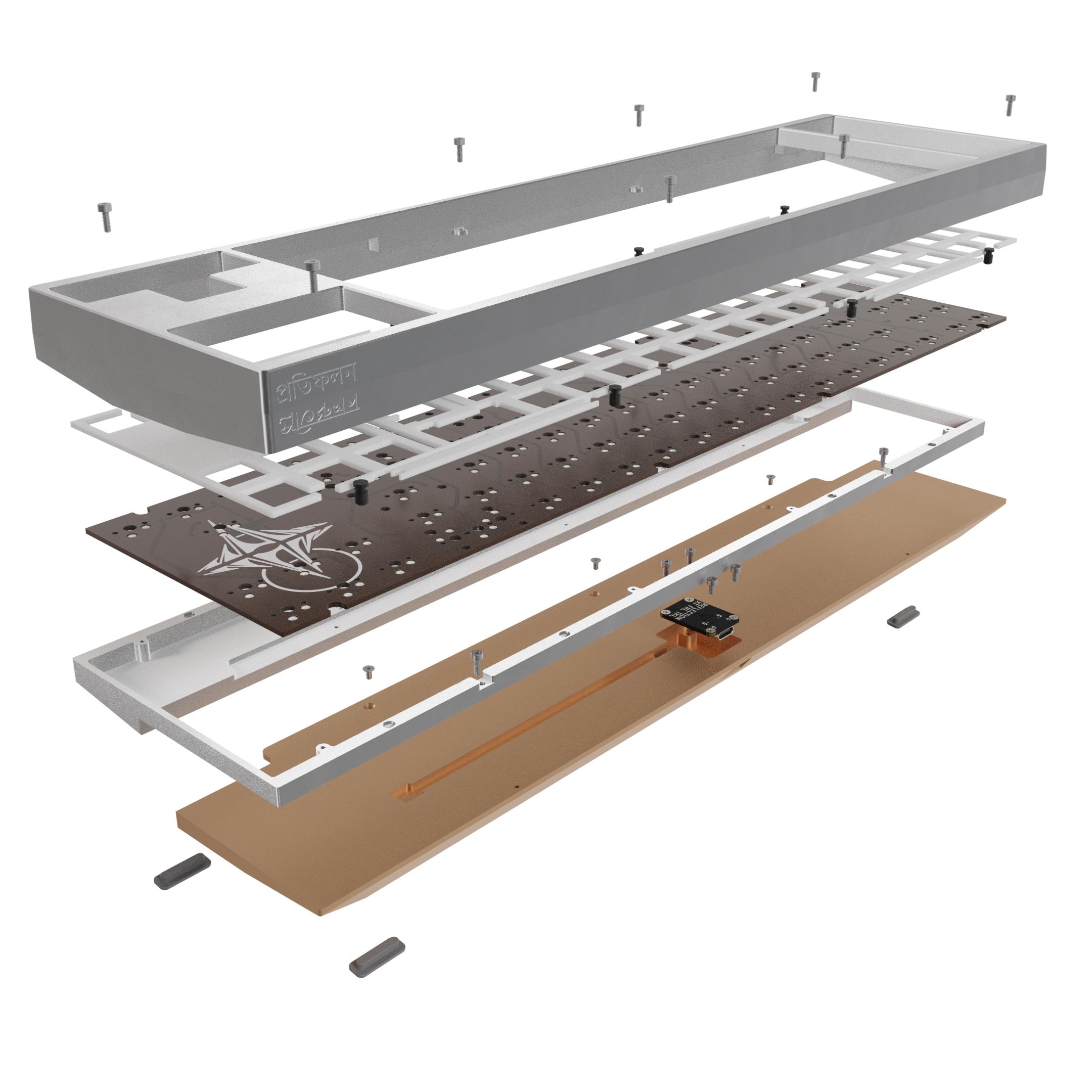 InternalThe board features an internal screw system to keep the weight design as clean as possible. The final screws will be black oxidized and recessed slightly below the plate to be as hidden as possible. The aluminum inner frame has an open bottom so the copper is effectively a through weight giving a nice contrast on both the bottom as well as the inside of the keyboard. The daughterboard is installed upside-down with the cable being colinear with the PCB molex connector eliminating the need to bend the jst cable in a channel. There are small press-fit bumpers placed next to the screw holes to eliminate any chance of case ping. There are no adhesives anywhere on the board so it can be unassembled fully.