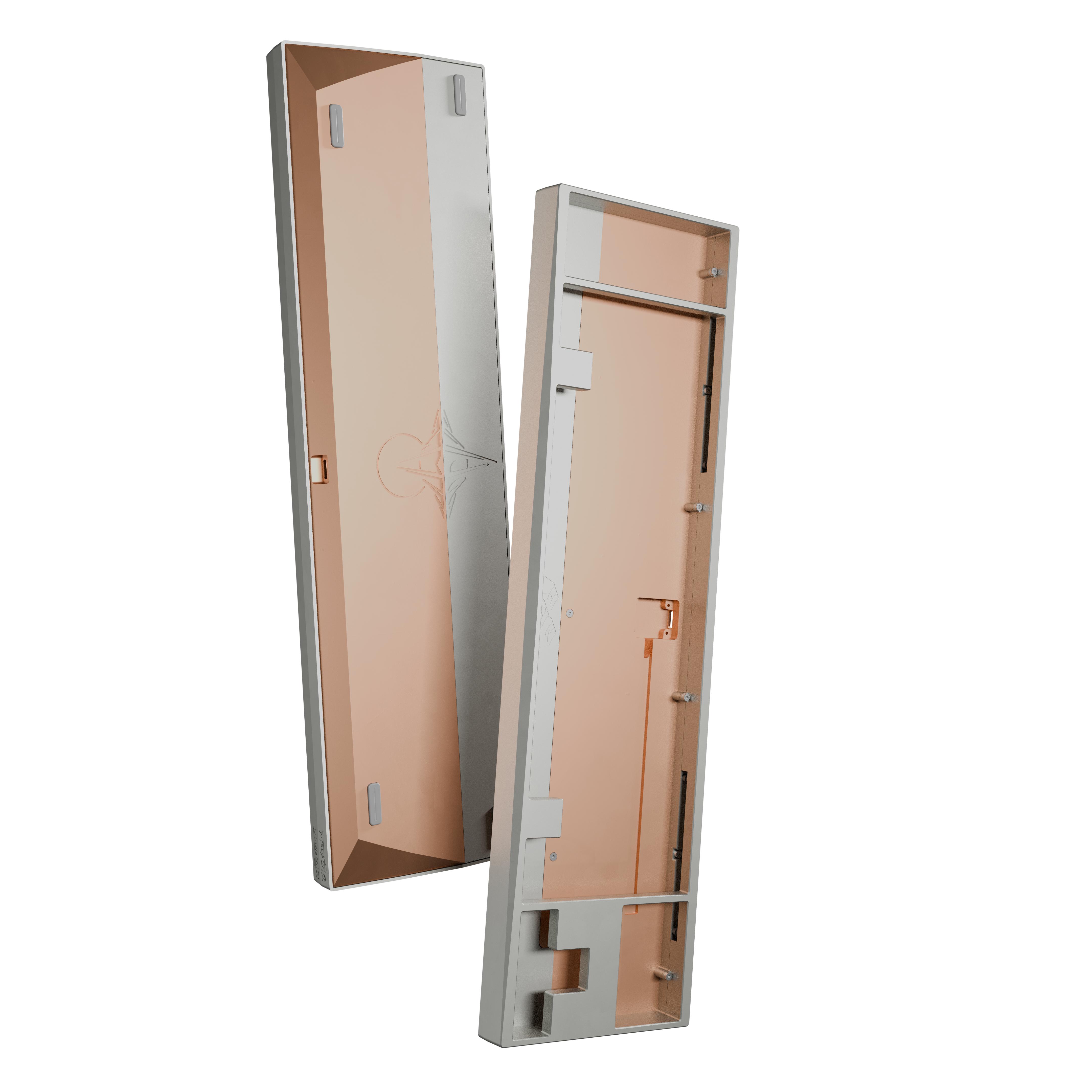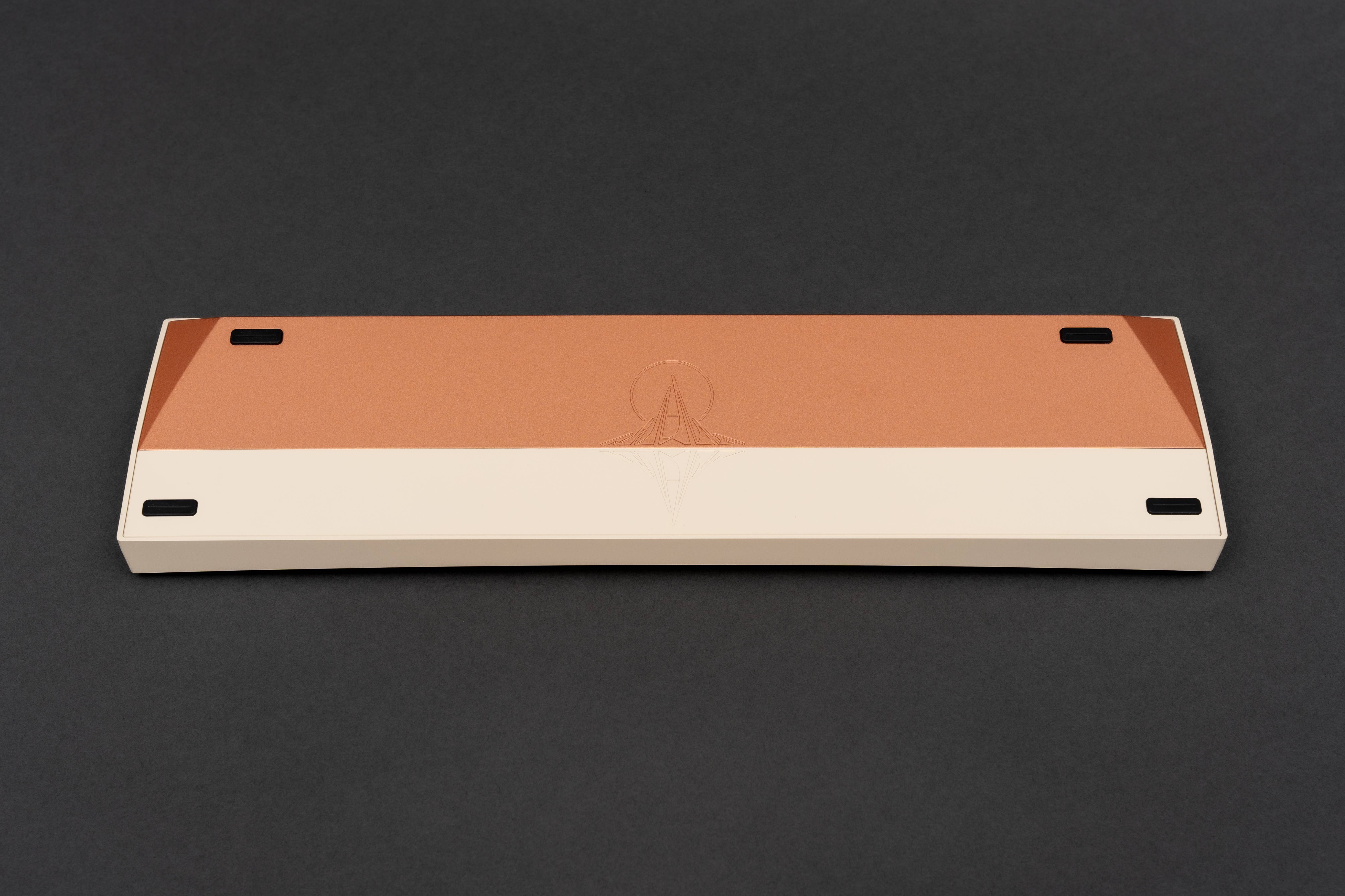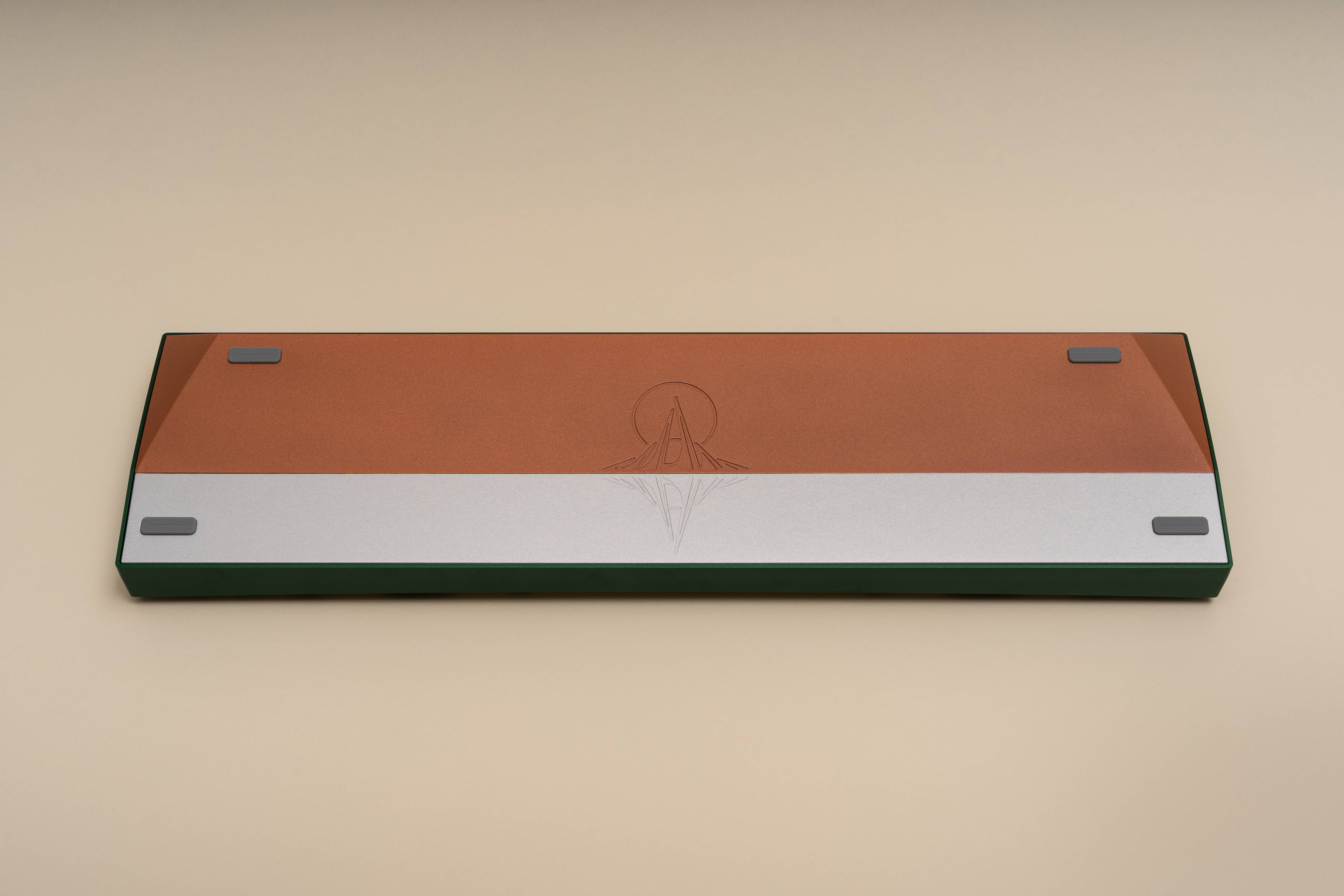 Design SummaryExternalReflection features a three-piece / three-tone design with a silver base, copper weight, and top color variants. It is an XT FRLTKL (basically a TKL with the F-row removed and a macro column on the side). The board features a large swept cut copper weight that follows the curve of the top piece side profile. The front of the board has a cherry lip of sorts - with the lip being the deepest in the middle and gently flowing into the chamfer on the side edges. There is a gentle cut on the sides and back of the board to give the perimeter some flair. Two engravings are present - one left justified on the back of the board and one on the underside of the board (see Inspiration). The mirrored engraving on the aluminum bottom is half the depth of the one of the copper weight to give the appearance of a “reflection”.