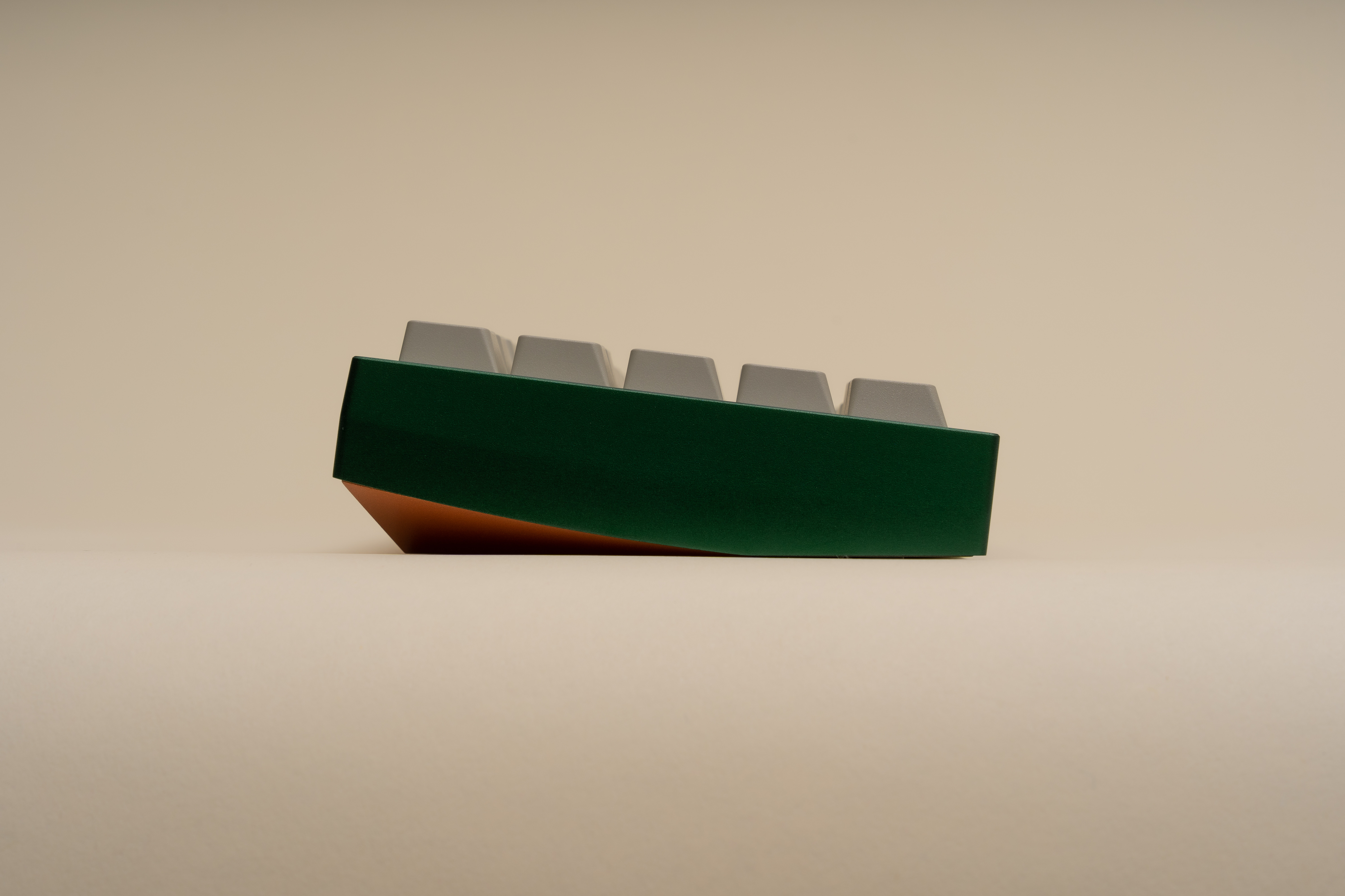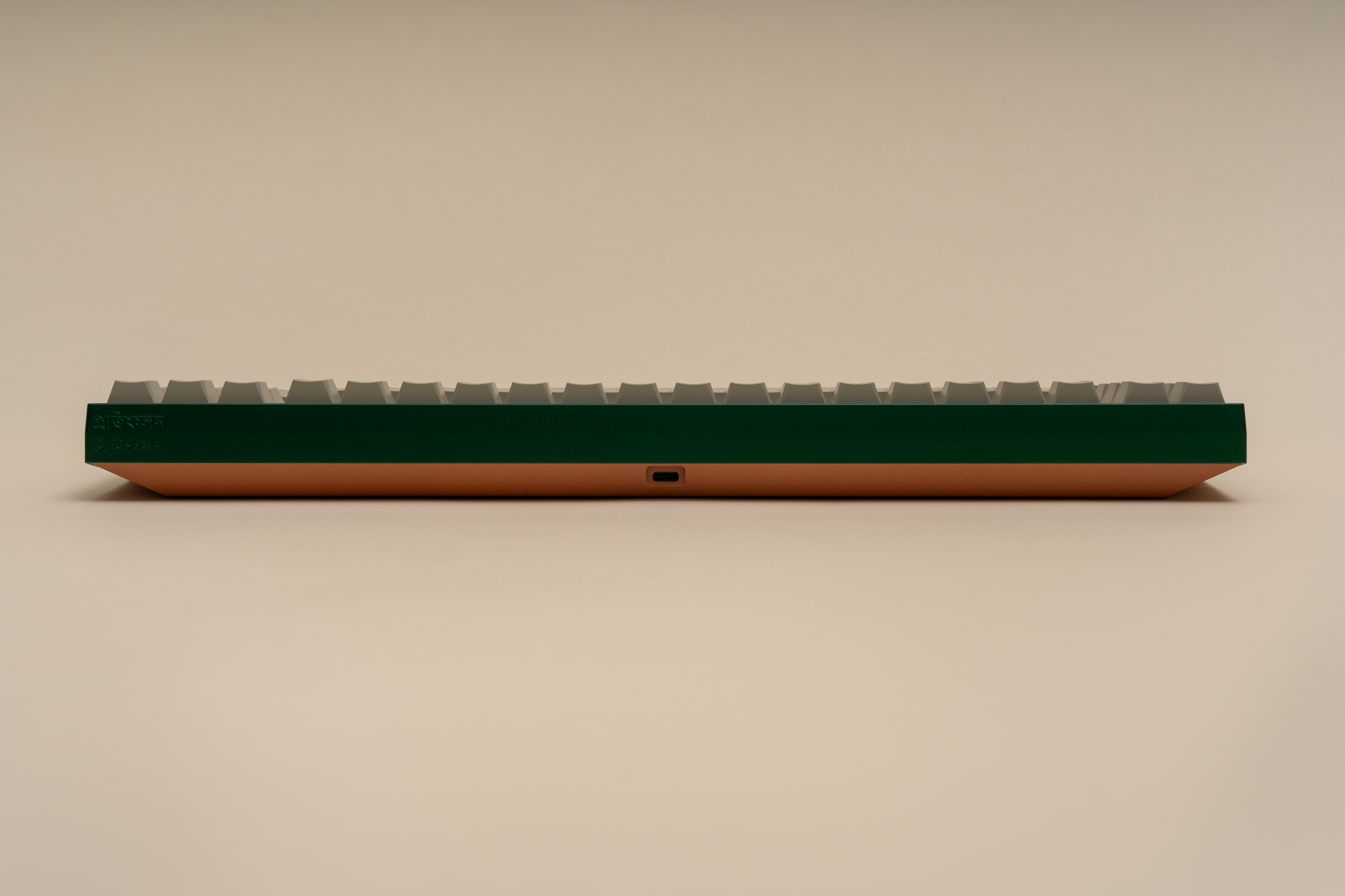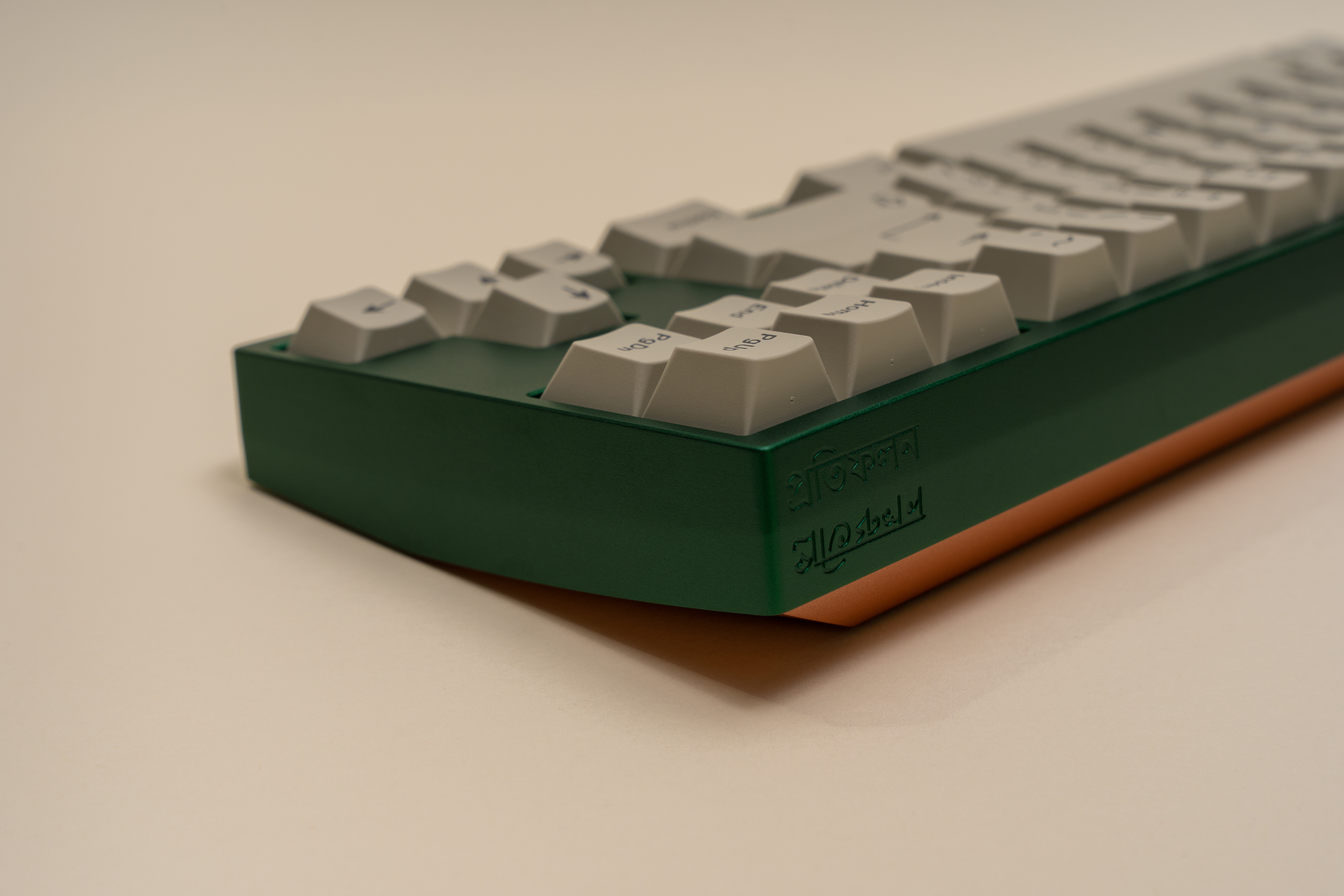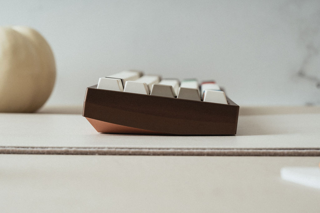 Design SummaryExternalReflection features a three-piece / three-tone design with a silver base, copper weight, and top color variants. It is an XT FRLTKL (basically a TKL with the F-row removed and a macro column on the side). The board features a large swept cut copper weight that follows the curve of the top piece side profile. The front of the board has a cherry lip of sorts - with the lip being the deepest in the middle and gently flowing into the chamfer on the side edges. There is a gentle cut on the sides and back of the board to give the perimeter some flair. Two engravings are present - one left justified on the back of the board and one on the underside of the board (see Inspiration). The mirrored engraving on the aluminum bottom is half the depth of the one of the copper weight to give the appearance of a “reflection”.