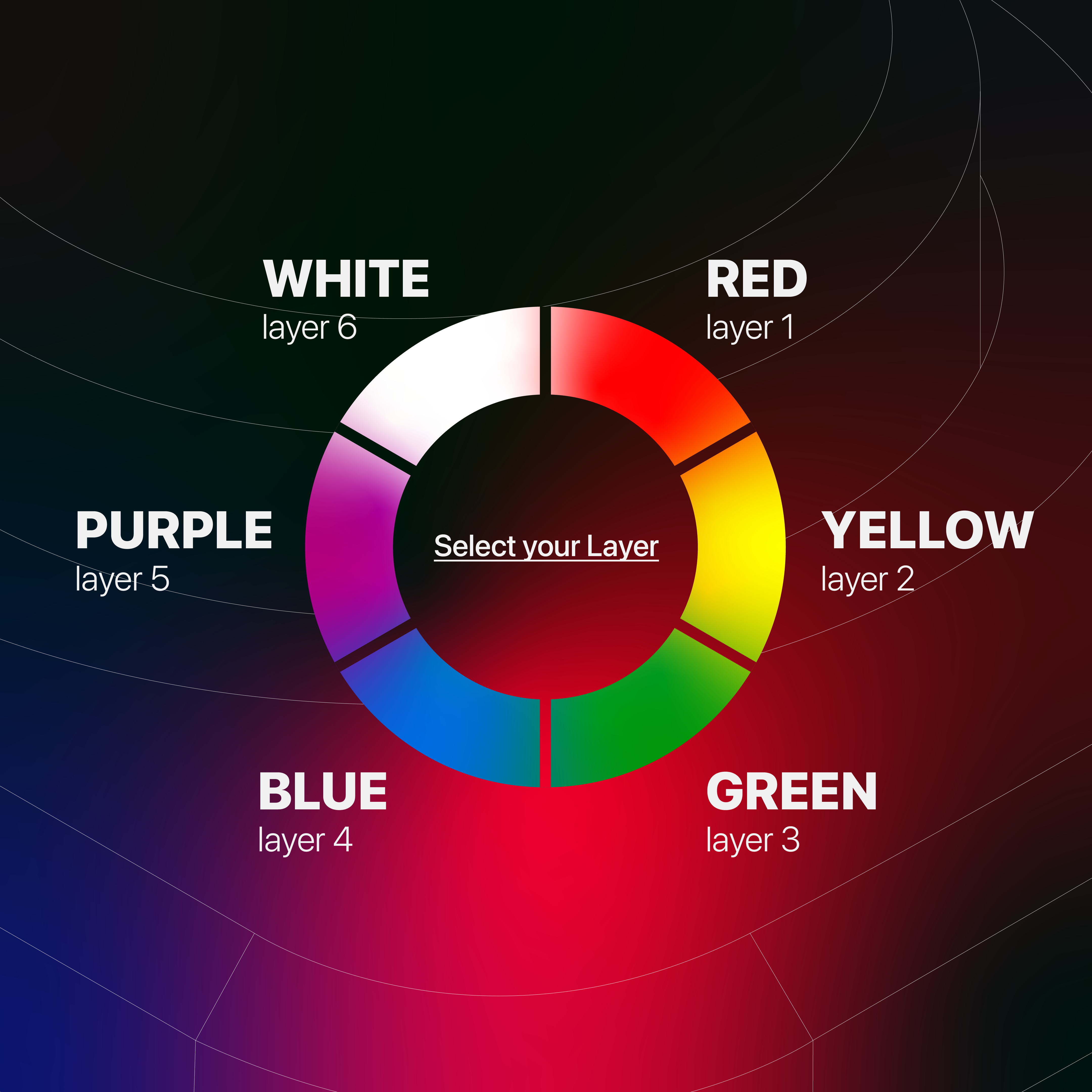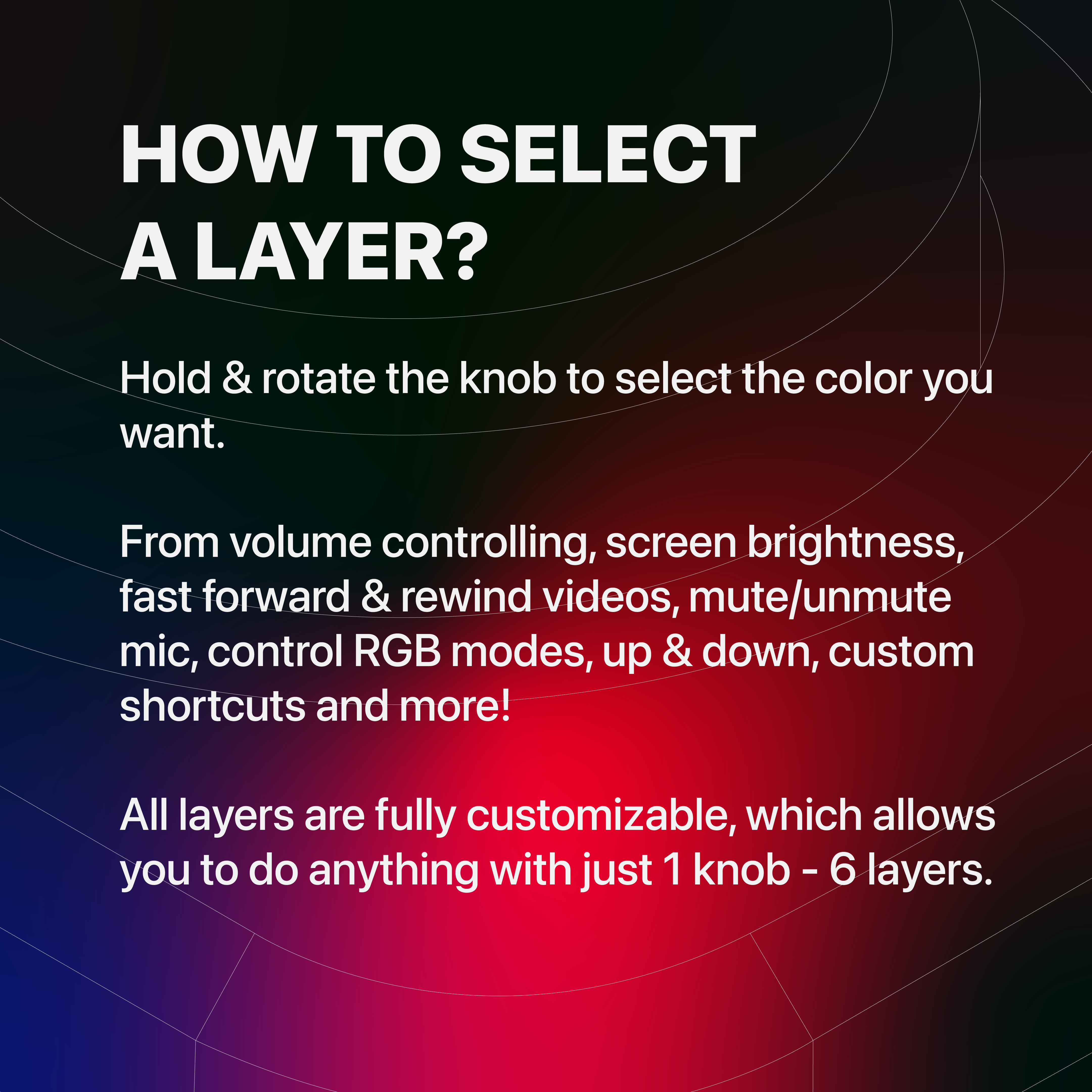To see the layers on your knob hold & rotate, 6 colors will be displayed as you do it. To select one, point the knob to the color of your choice (the brightest color is the one being selected).