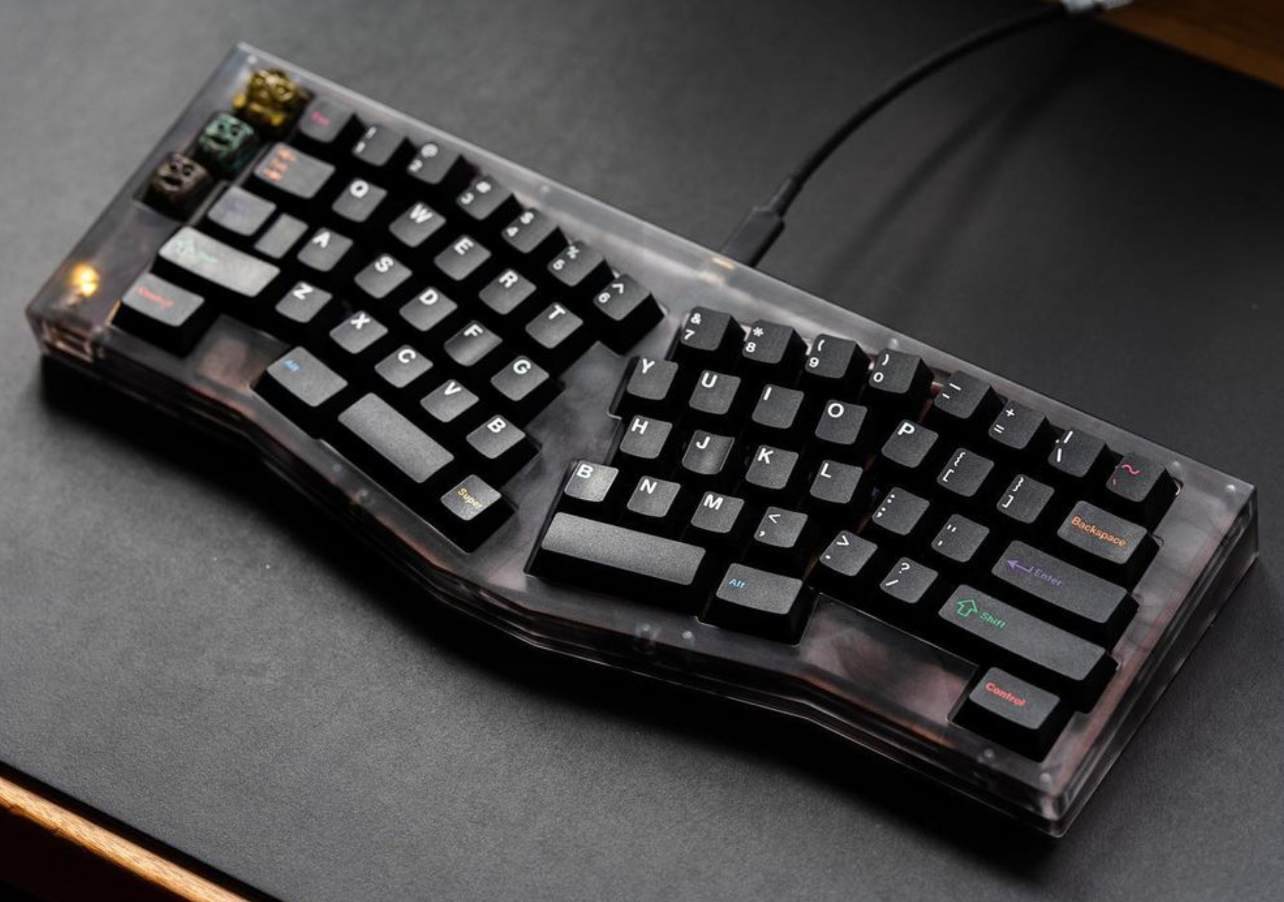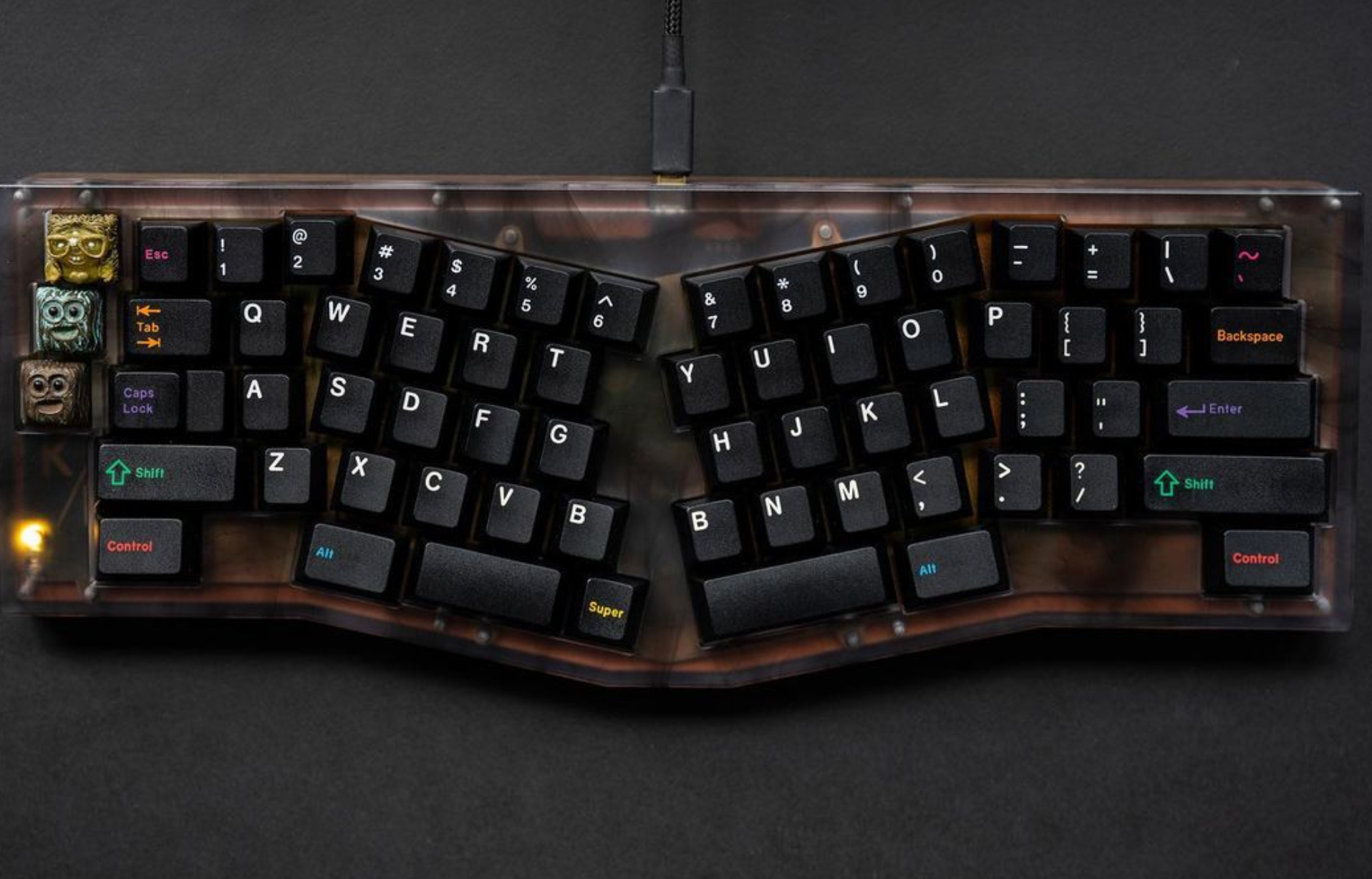 Hello I'm Rik - here is the Rikia. Rikia is an Alice style (compatible with existing USB-C Alice PCBs and plates) board designed at the request of a good friend to soothe the pain from a certain failed groupbuy he bought into. The board is top mount and consists of a PC top with either copper or aluminum bottom.
