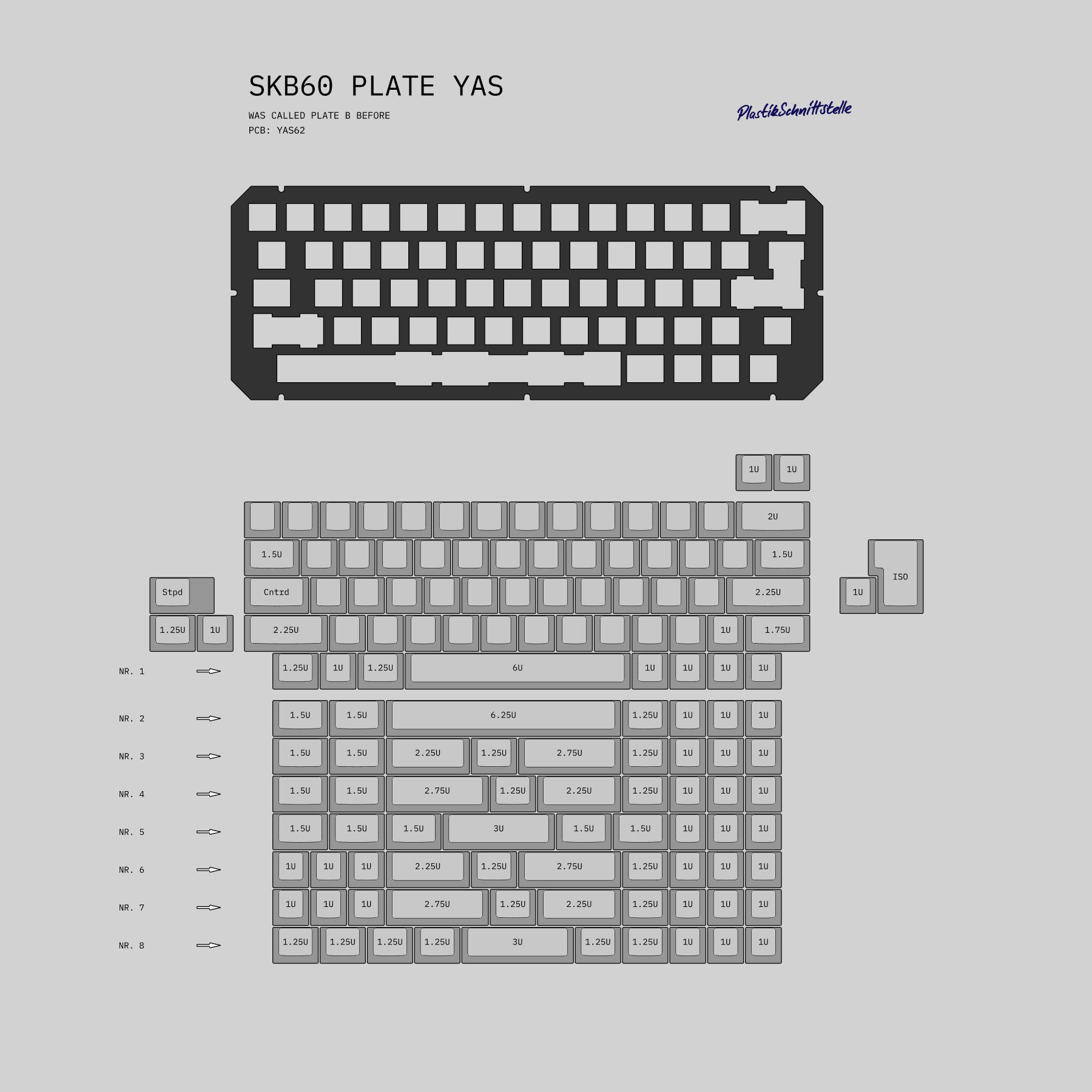 For the 60% there is plate A that supports most popular layouts including split spacebar. The YAS PCB gets its own plate. 65% 75% each have one plate, both support split spacebar as well.