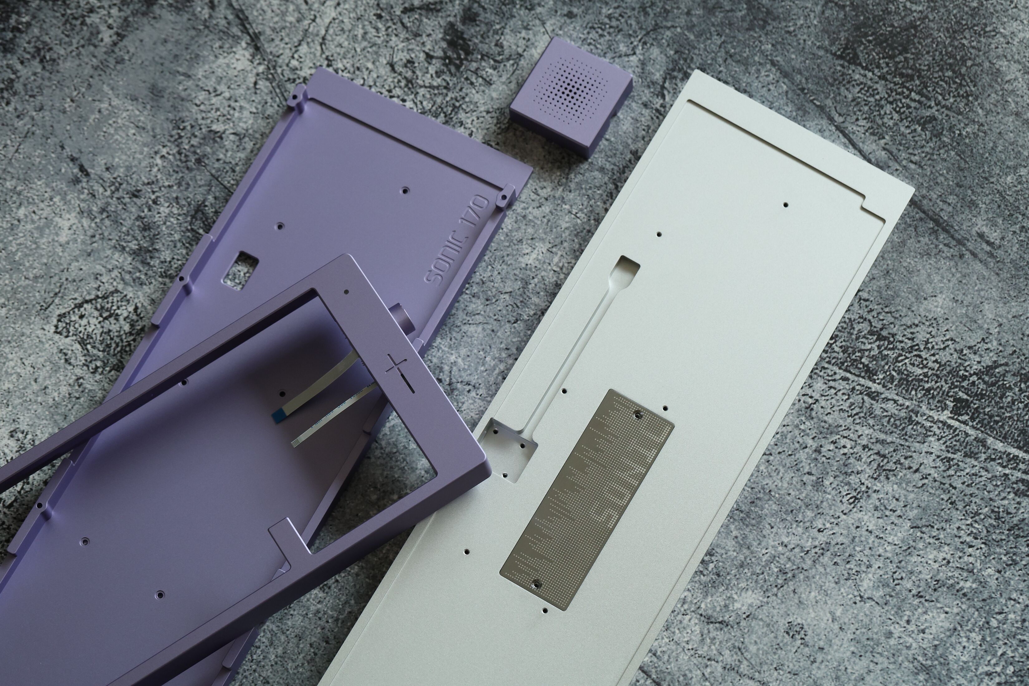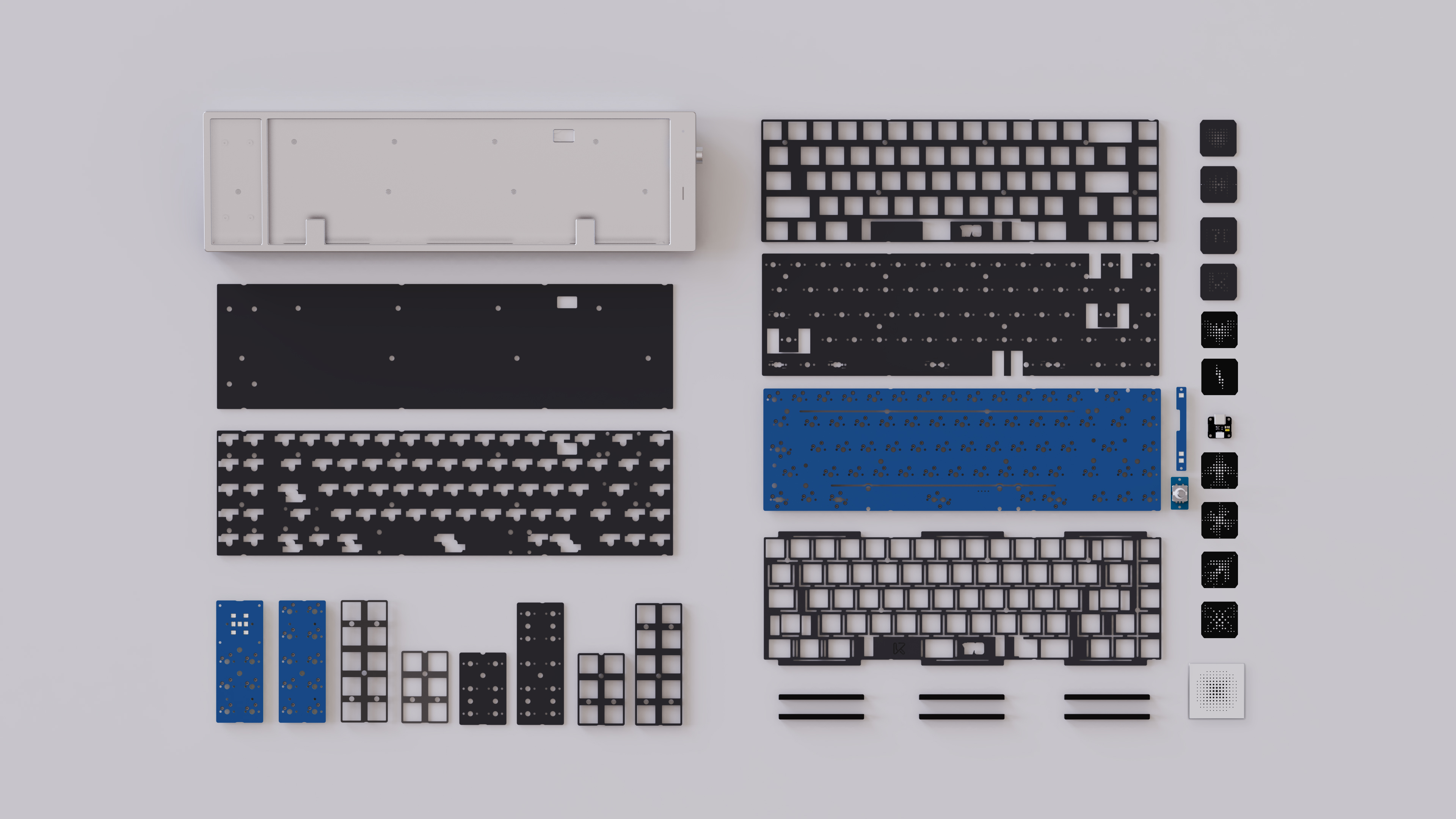 Kit content: Aluminum Top Case Aluminum Middle Case Aluminum Bottom Case Stainless Steel Weight Plate (Total of 3 plates - 1 main and 2 macro plates) PCB (Total of 3 PCBs - 1 main and 2 macro PCBs) Silicone Gasket Strips Daughterboard and JST Cable Foam Pack Screws 10x 4u Light Module Cover Rotary Module and Knob