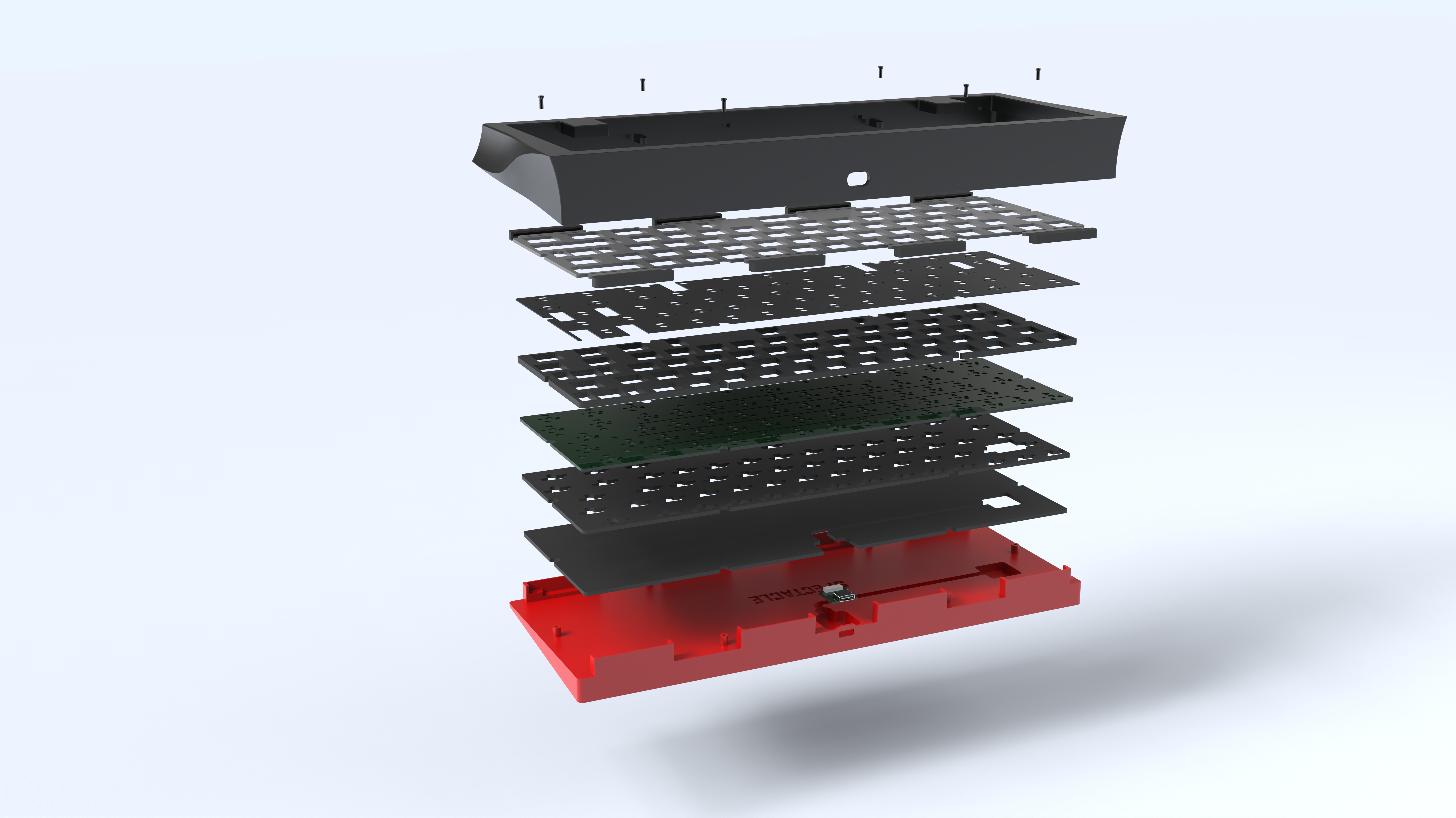 ▼ Given the extremely minimalist design of the keyboard, we do not want any exposed screws on the exterior to break this ultimate simplicity. Therefore, we have designed a screw-less structure that secures the bottom cover from the inside of the keyboard. The mount chosen for this keyboard is a standard gasket mount, however this uses gasket socks, for ease and precision of placement of the gaskets onto the plate tabs. These gasket socks are thinner on the top and thicker on the bottom to try to optimise sound and feel at the same time~