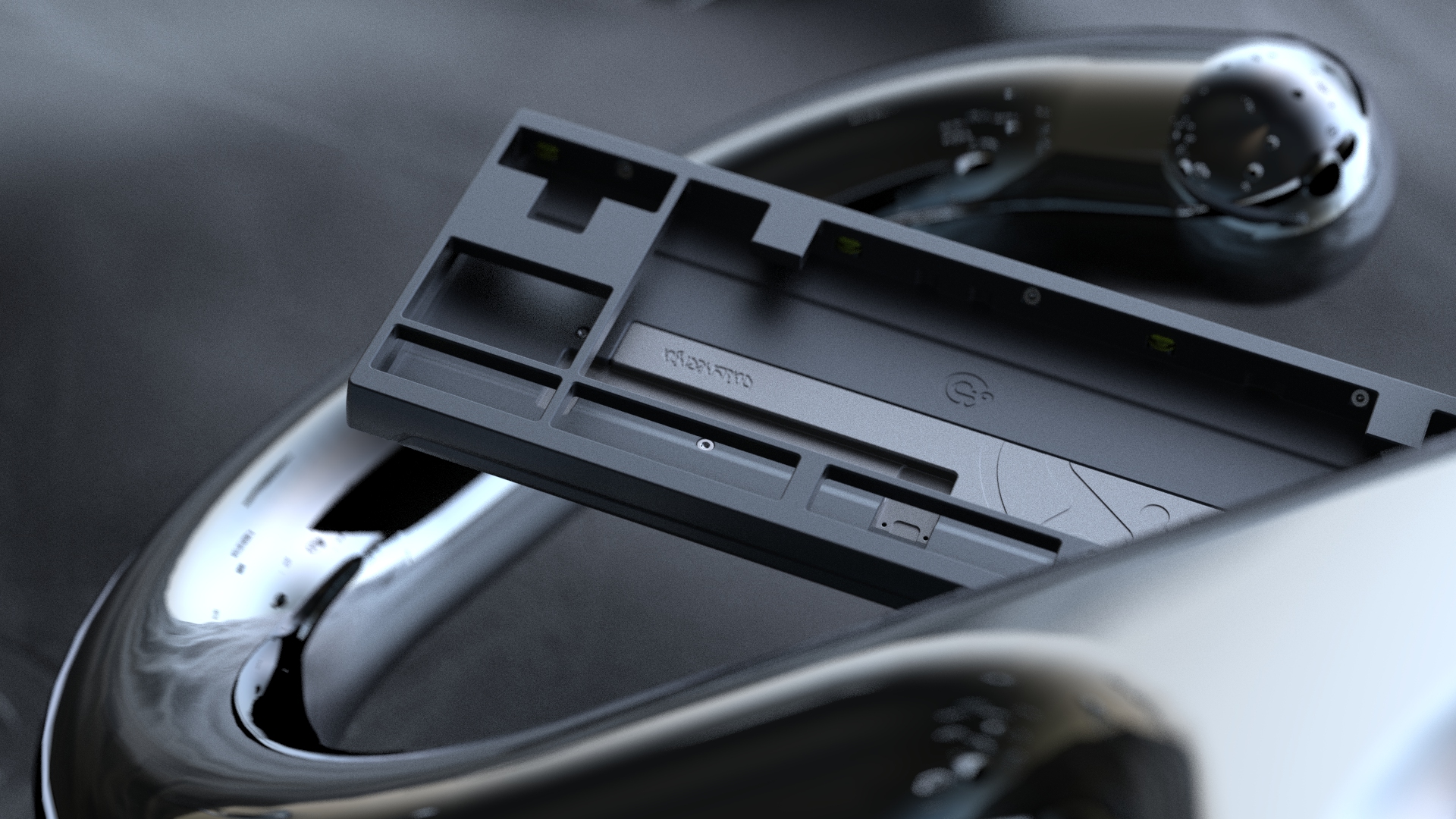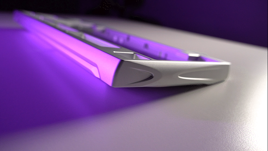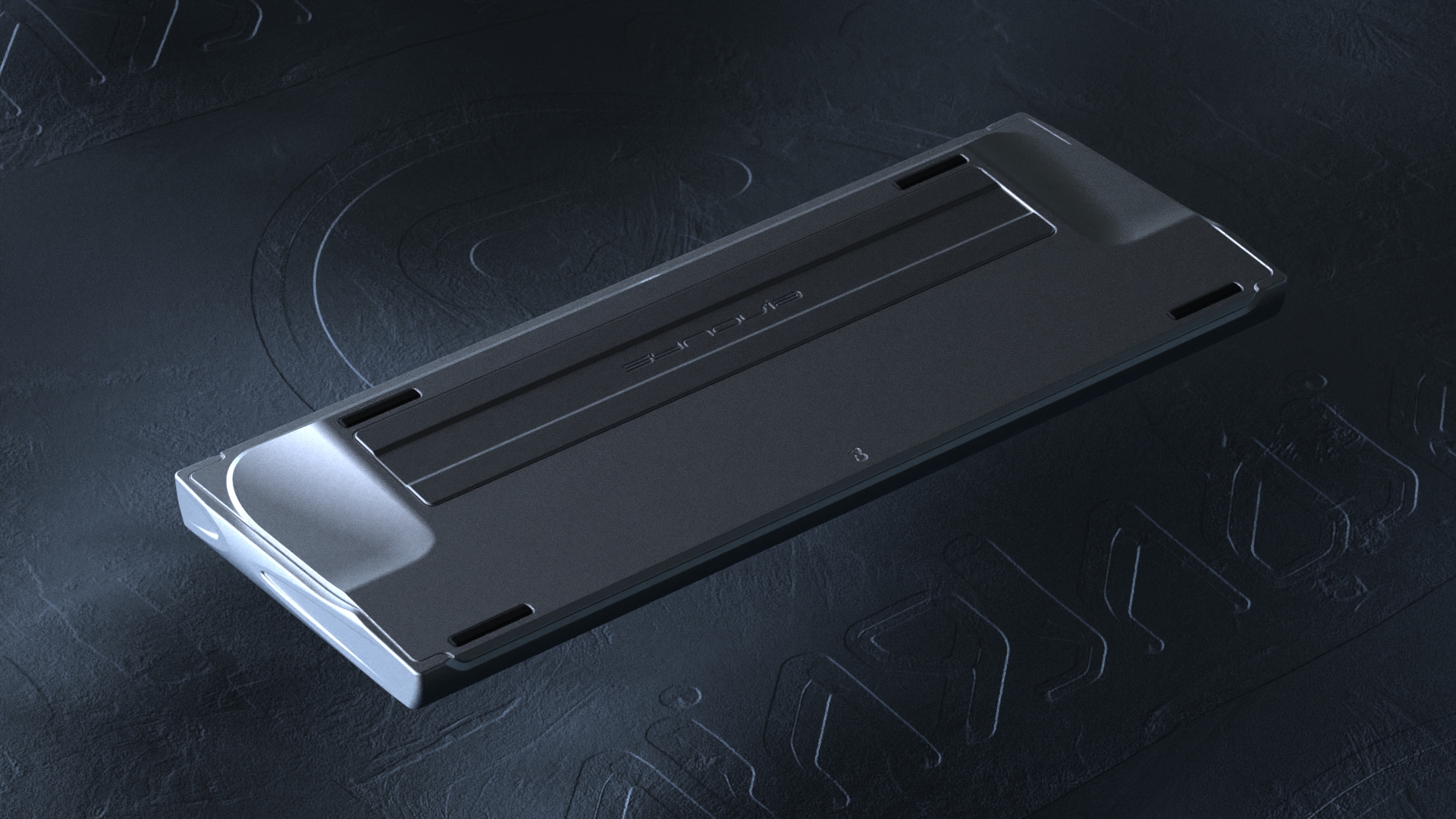 Demoscene, Drum and Bass, Frosted tips, Silver tracksuits, Fisheye lensesIntense shapes created by 5-axis machining. Stainless Steel plate mounted with Silicone Dampers provides clacky sound, soft typing comfort and bounce