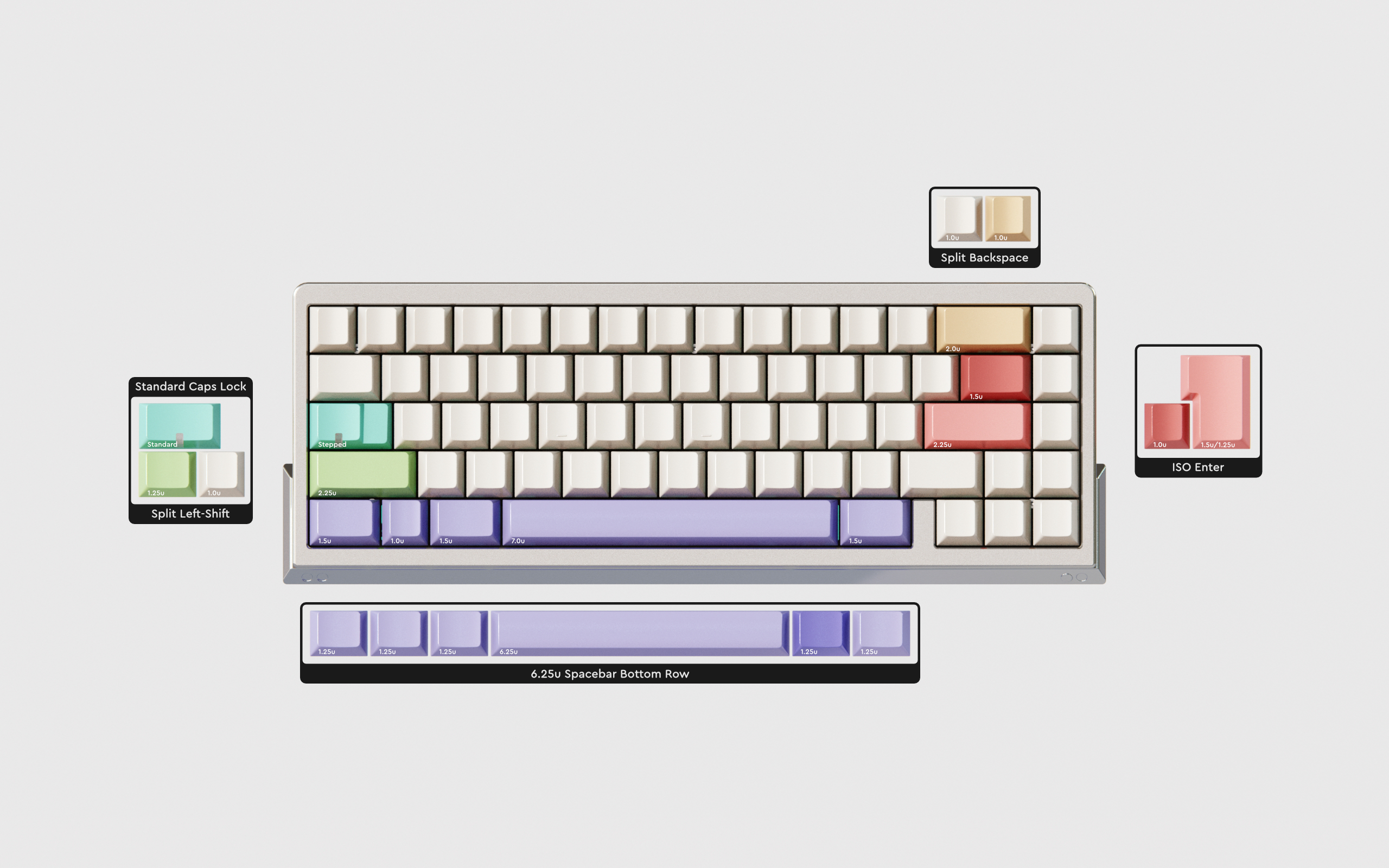 | split backspace, split left shift, ANSI/ISO enter, 6.25/7u spacebar