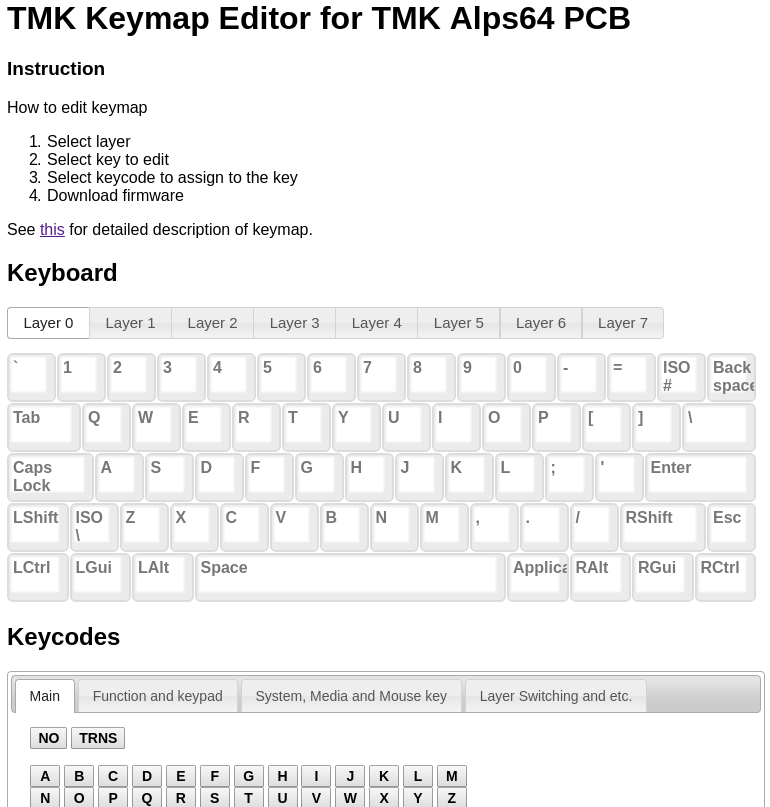 How to remapFirmwareTMK keymap editor for Alps64You can edit keymap and download firmware here.