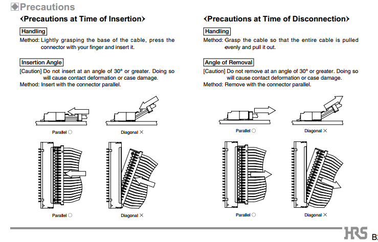 To remove/unmate hold many cables as possible with thumb and index finger and wiggle the connector laterally each side within 15deg range.