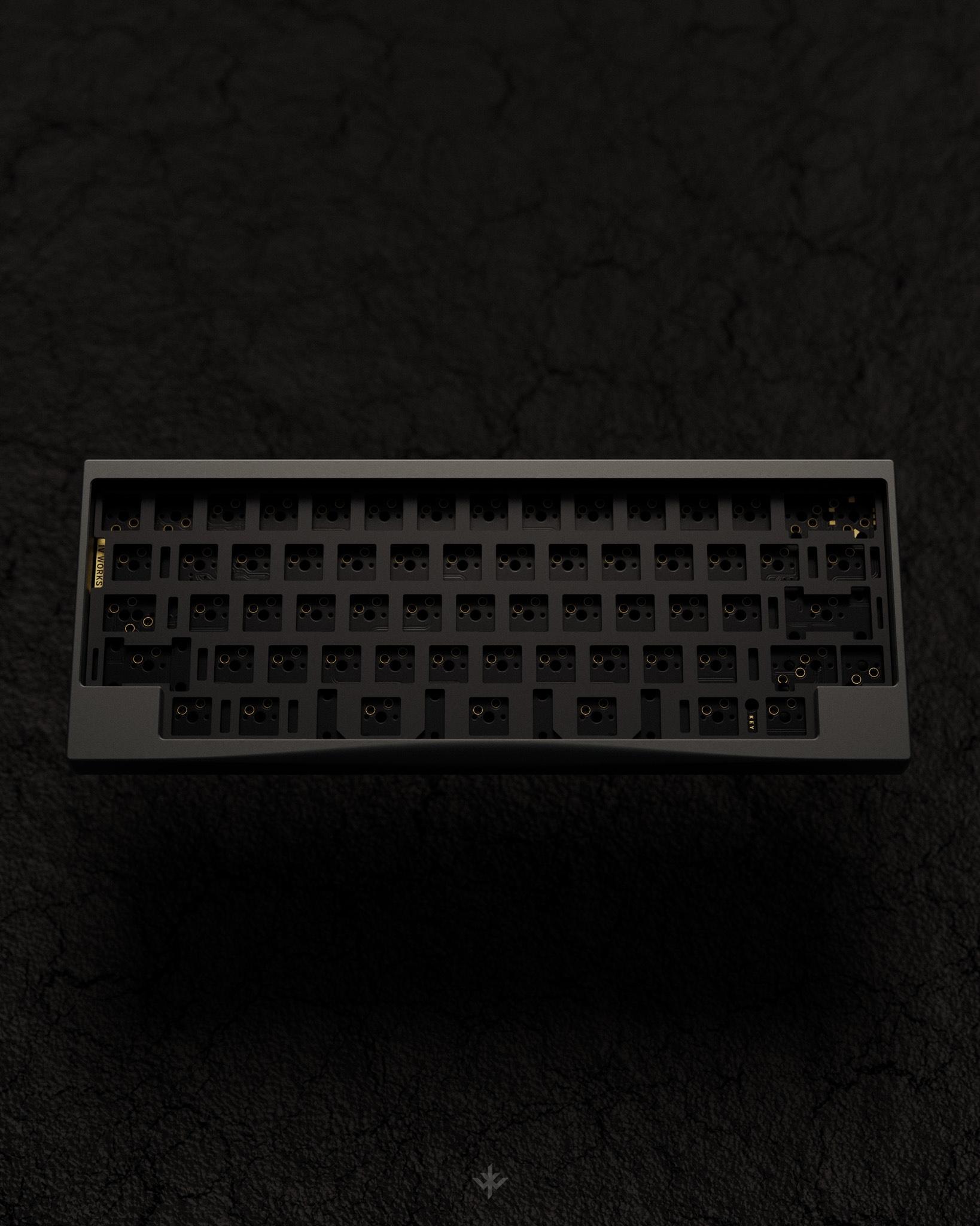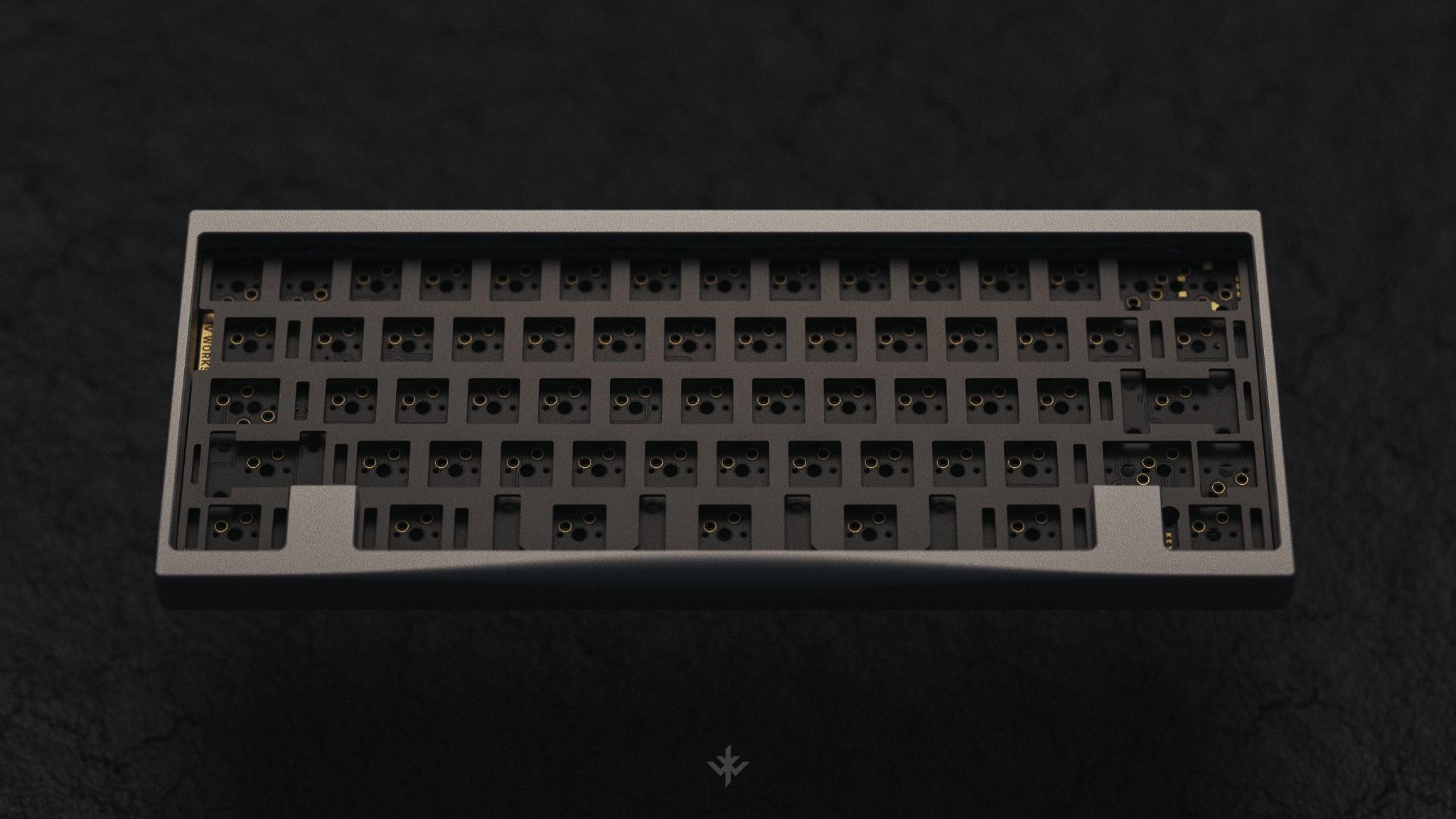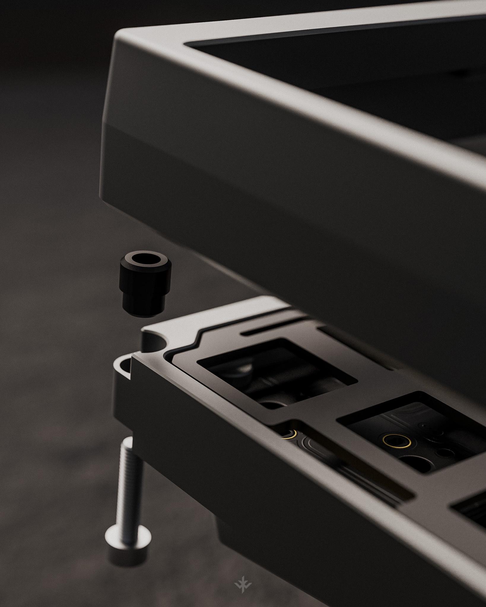 PERFORMANCE - Integrated 8 point silicone force-break to prevent unwanted resonance. - Maximized internal mass while maintaining plate flex and low front height. Provides sound diffusion helping isolate second reflections. - Optimized plate mounts for unformal flex at home row. No mounts under the spacebar for best typing feel. - Distance between the bottom of switches to case is equal across the board. - Sound travels uninterrupted between PCB and bottom aluminum case. No weights, daughter board, foam, or screws are exposed to the bottom of PCB. Producing a uniform and bright sound-signature. JST cable is routed from the back of the chassis.