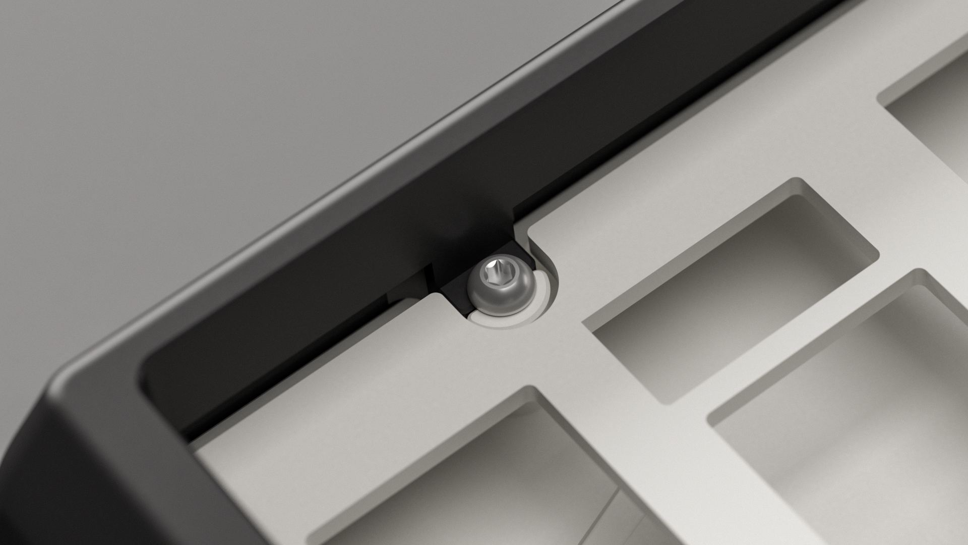 The screw itself is split resting between the two different halves of the cases, which not only allows an even weight distribution, but makes this whole system possible by not interfering with the switches.