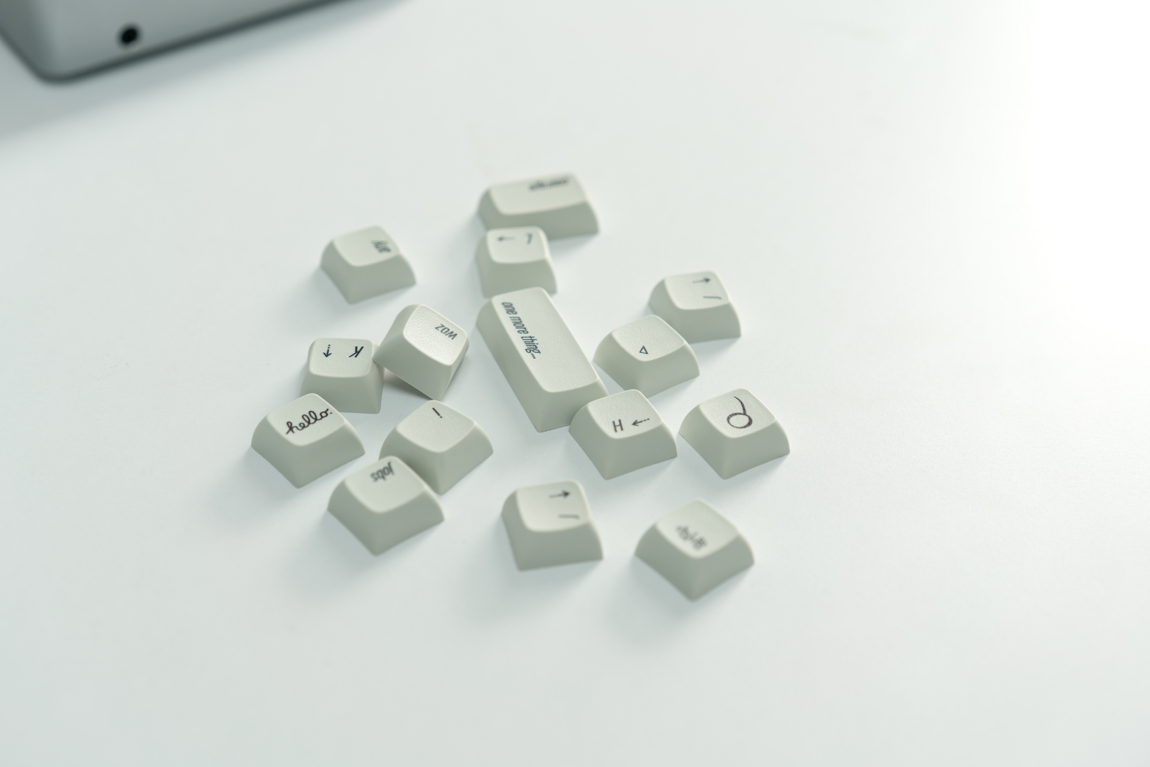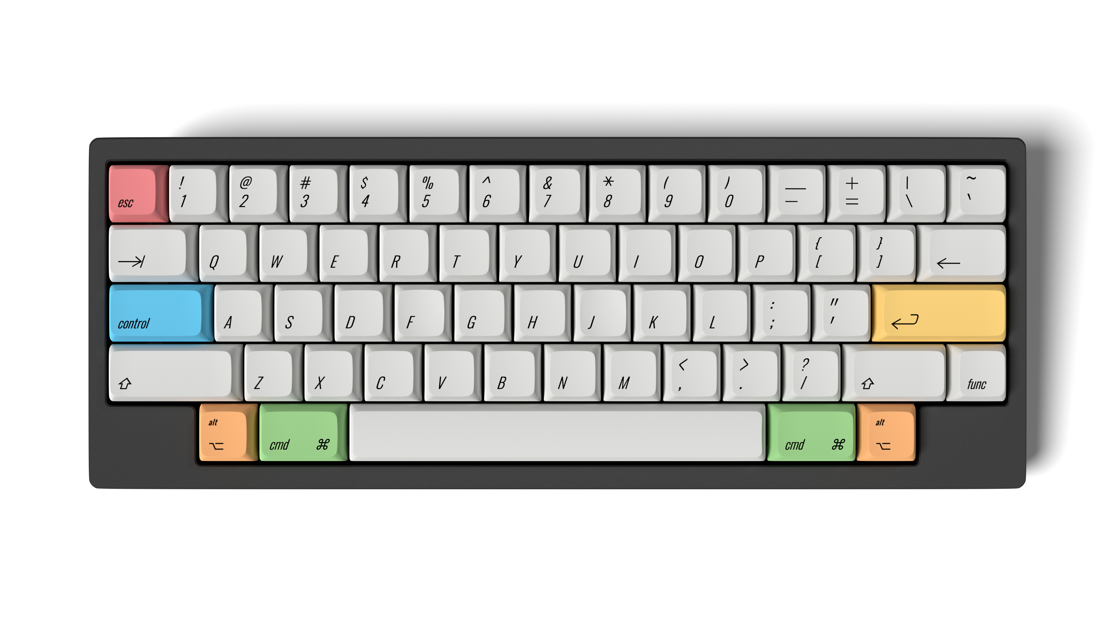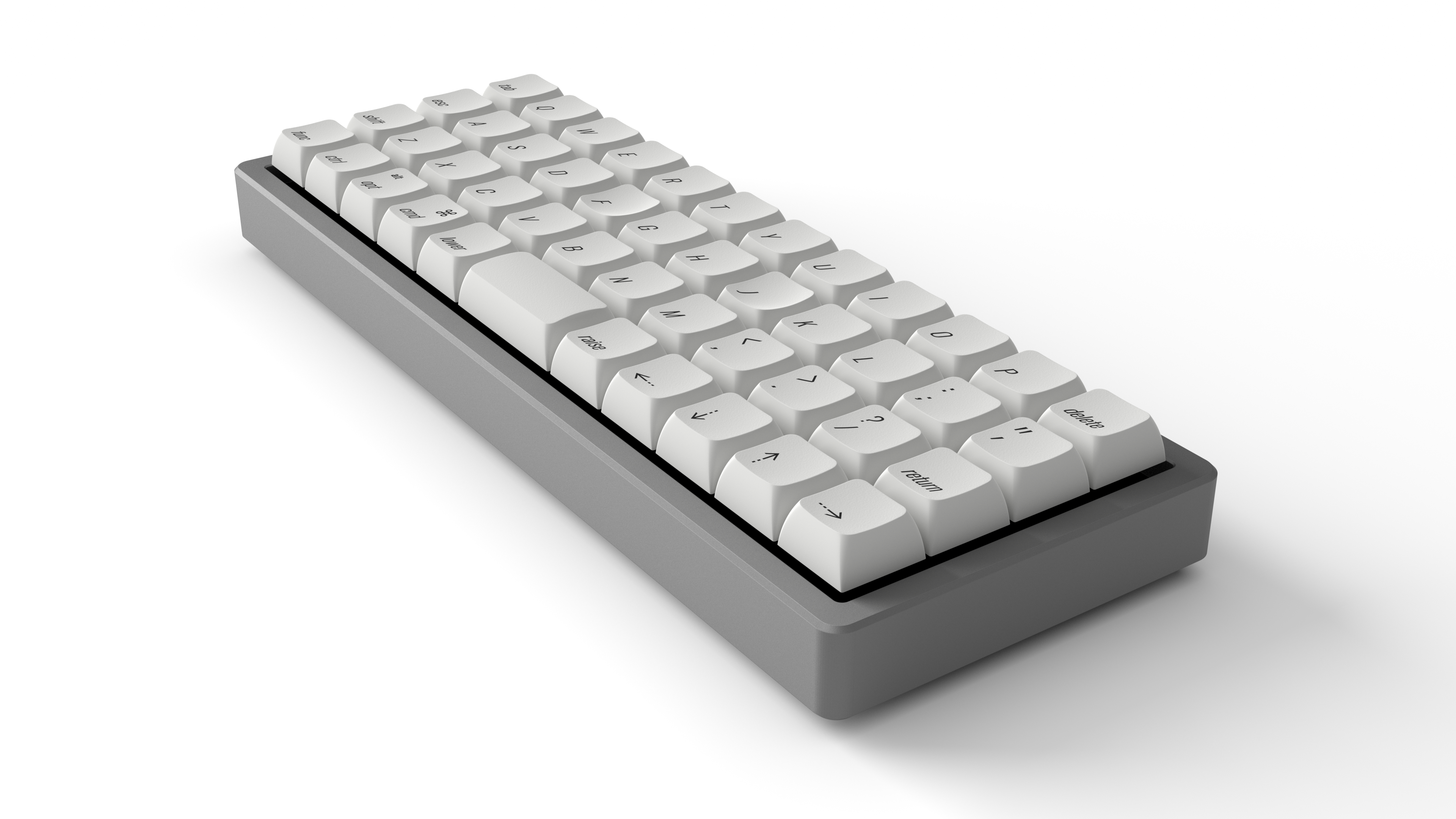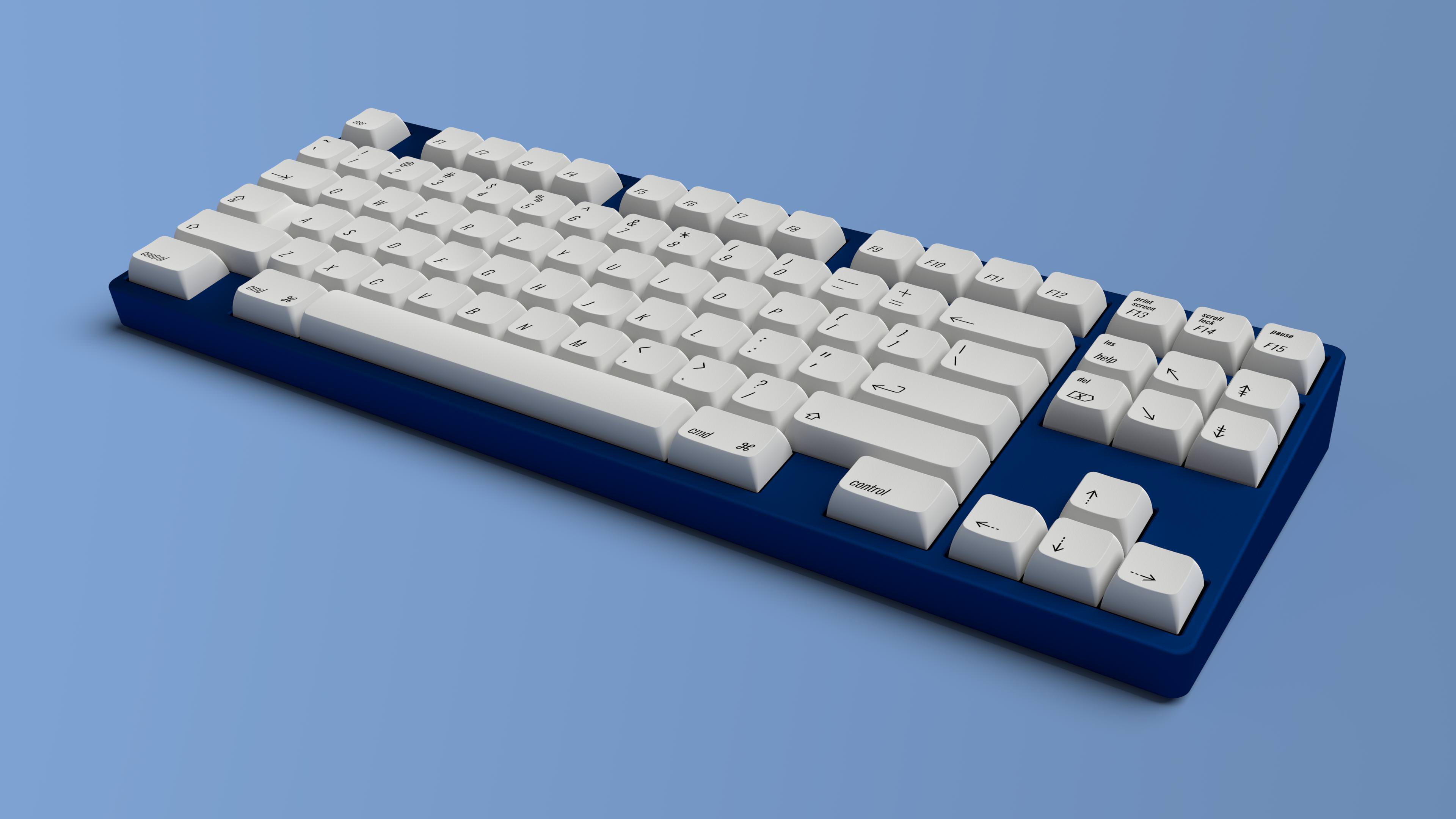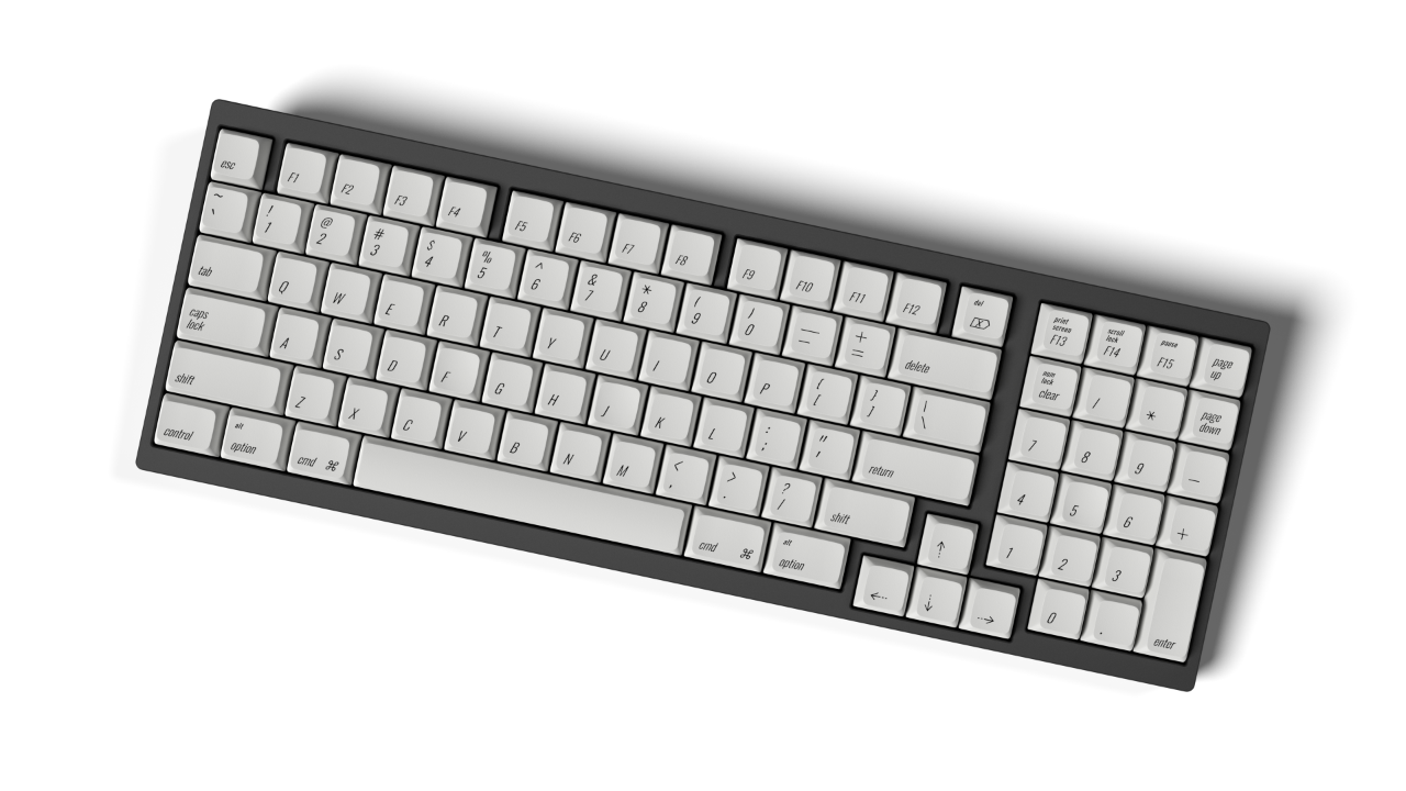 IC thread linkXDA Oblique is a keyset inspired by the keycaps of the AEK, M0116, AEKII, and similar Apple keyboards. The font used in this keyset is Oswald Light and is angled at 17°. This is a very close to Univers 57 Condensed Oblique, the font used on the AEK. I have modified/resized some of the symbols to match the AEK. Even Univers 57 isn't an exact match to the AEK's font though; it is slanted at a smaller angle and several of the symbols are different. The colour will be Pantone Cool Grey 2 U, which matches Apple's colour very well.