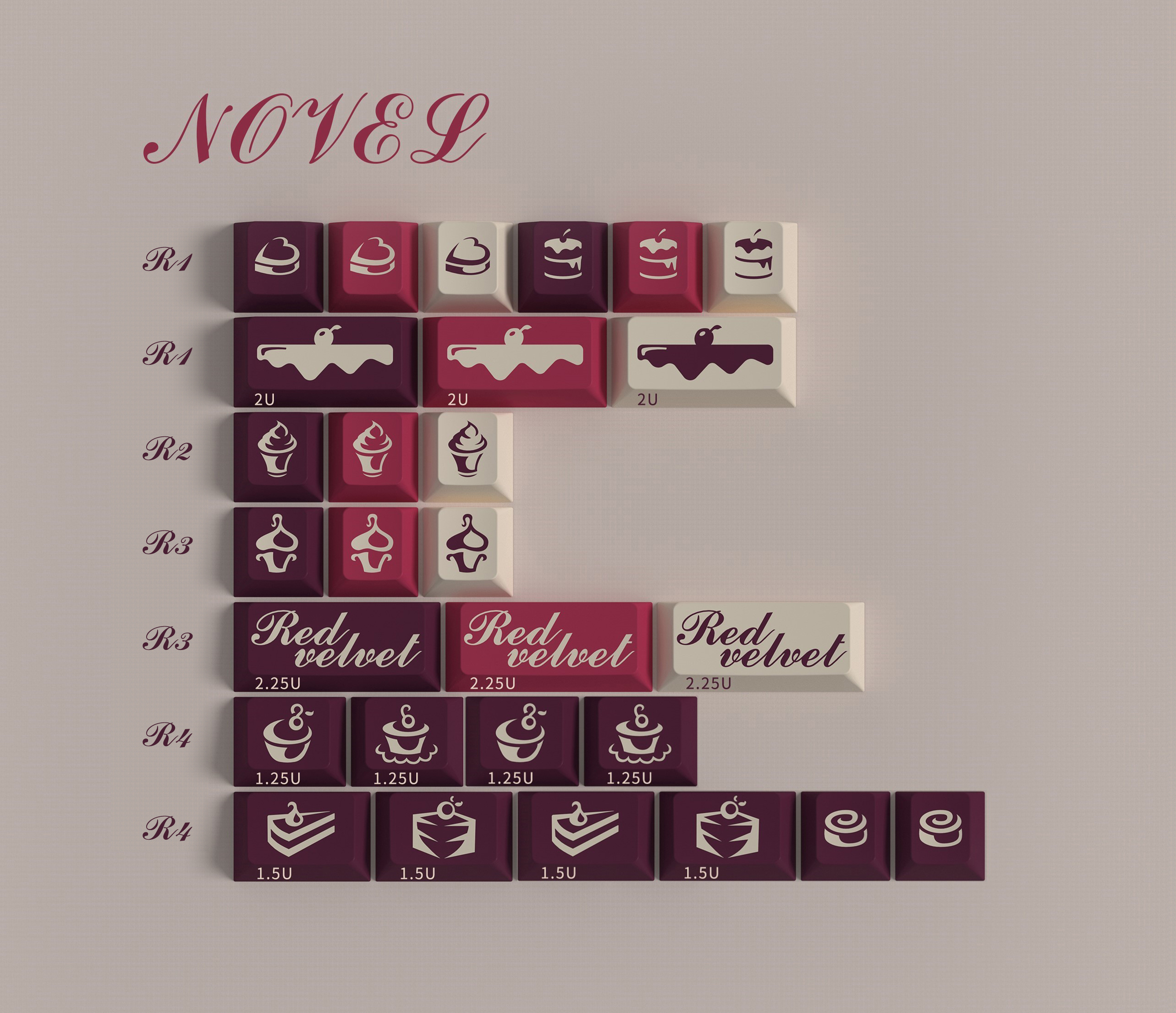 Are you like me! Can’t resist the sweetness of red velvet cake? Then, our latest red velvet themed keycaps will definitely make you fall in love with it! With the magenta of red velvet cake and the purple of cherries as the main colors, paired with the milky white of cheese cream, each novel is a unique sweet design. Various types of red velvet cakes are subtly integrated into the keycap design, making your keyboard full of sweetness and romance instantly!