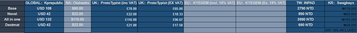 Kit Pricing Some Vendors don't yet have their selling prices, so I'll update later
